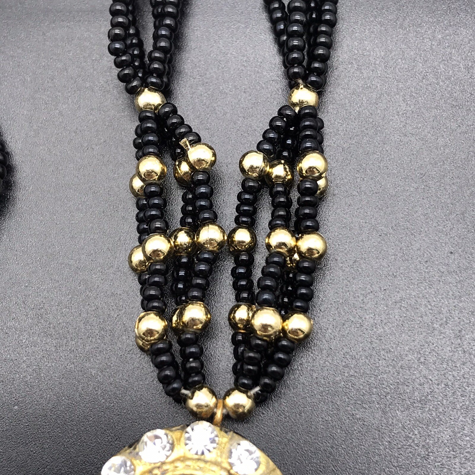 Vintage Seed Bead Multi Strand Collar Pendant Necklace Ornate Rhinestones Dangle