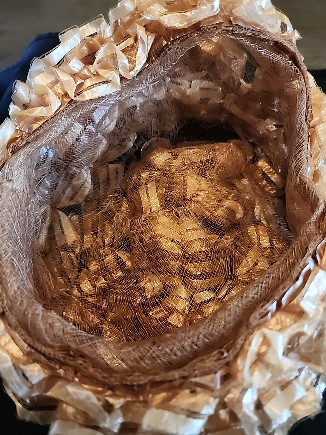 как выглядит Vintage Acrylic Ribbon Ruffled "Rafia Look" Pillbox Hat Beige Unmarked Church фото