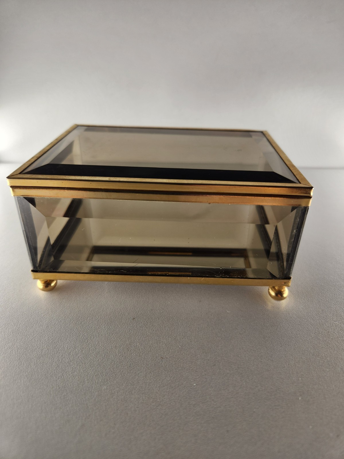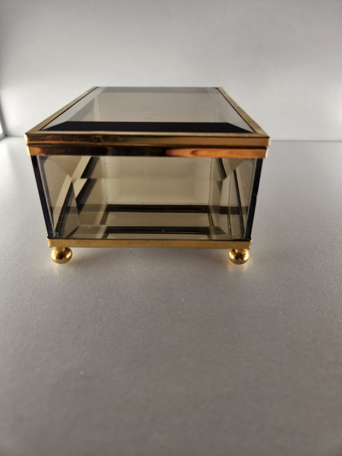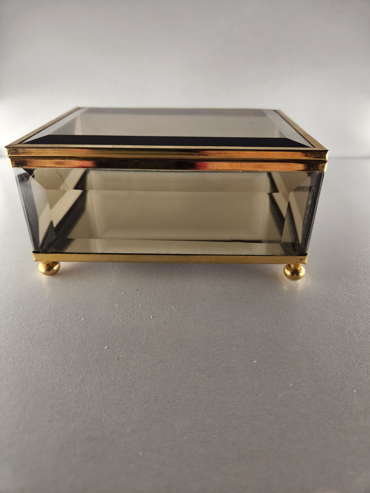 как выглядит Vintage Brass And Beveled Glass Jewelry Box With Mirror 4 Footed фото