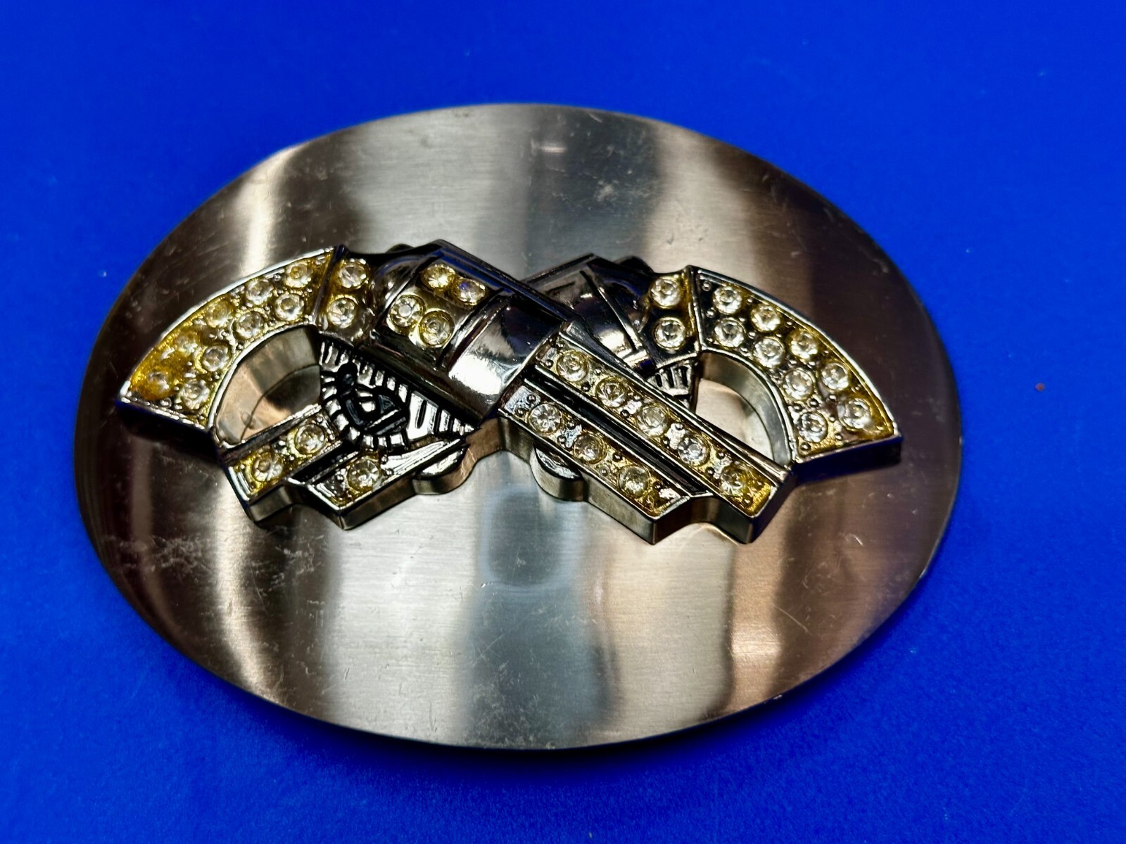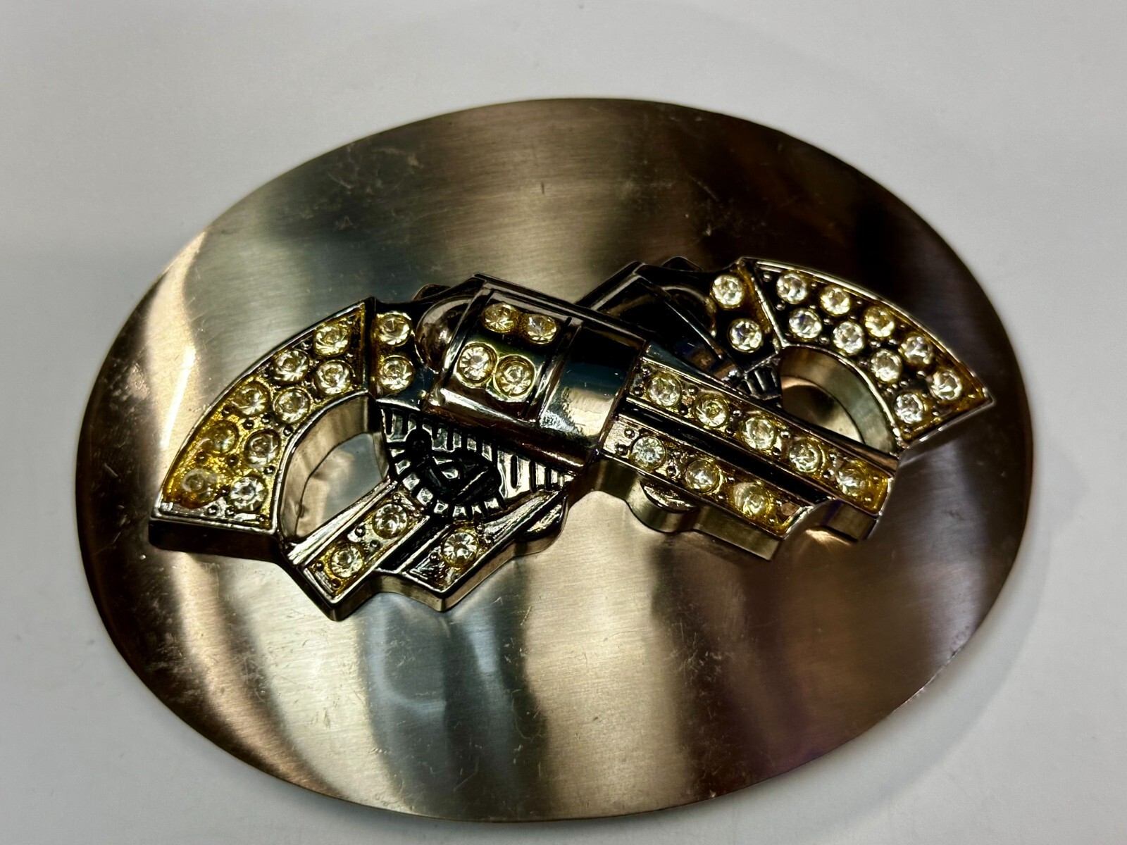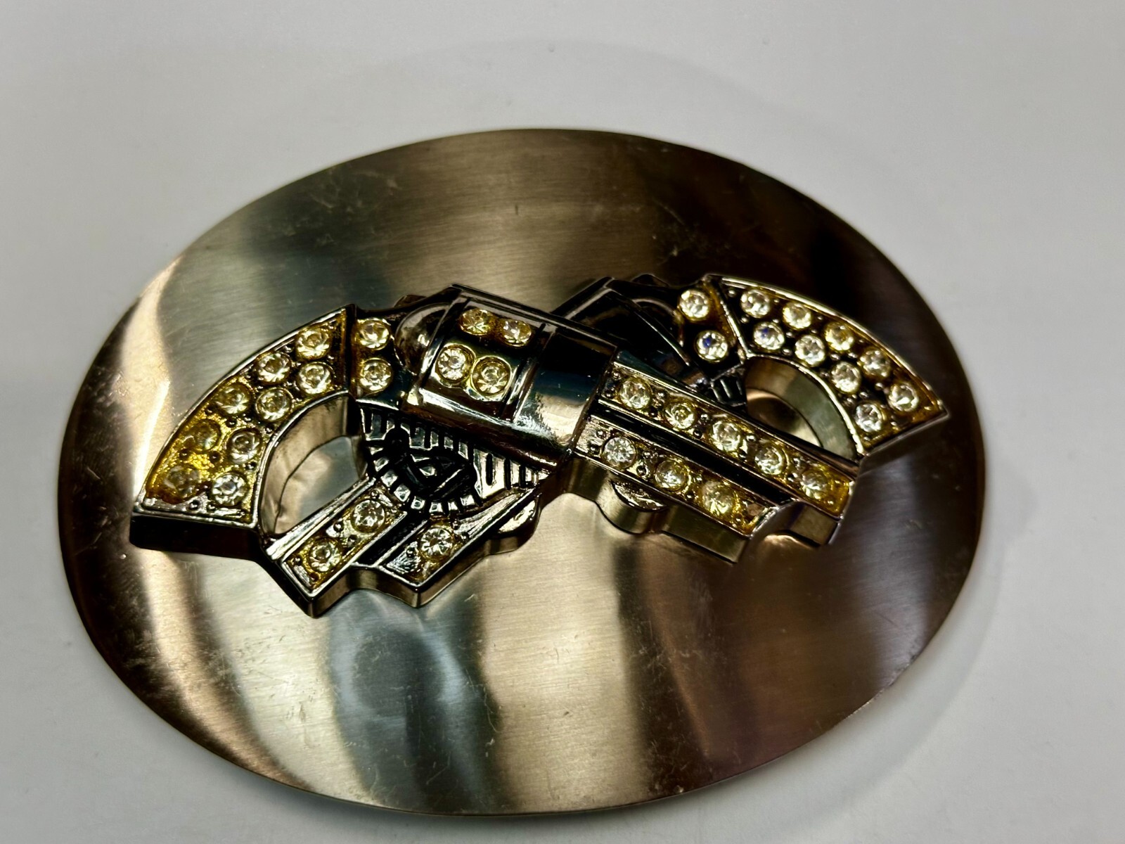 как выглядит Crossed Guns Six Shooter Pistol Rhinestone Accented Huge 5.5" Belt Buckle фото
