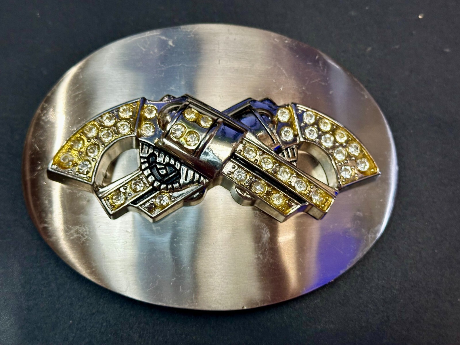 Crossed Guns Six Shooter Pistol Rhinestone Accented Huge 5.5 Belt Buckle