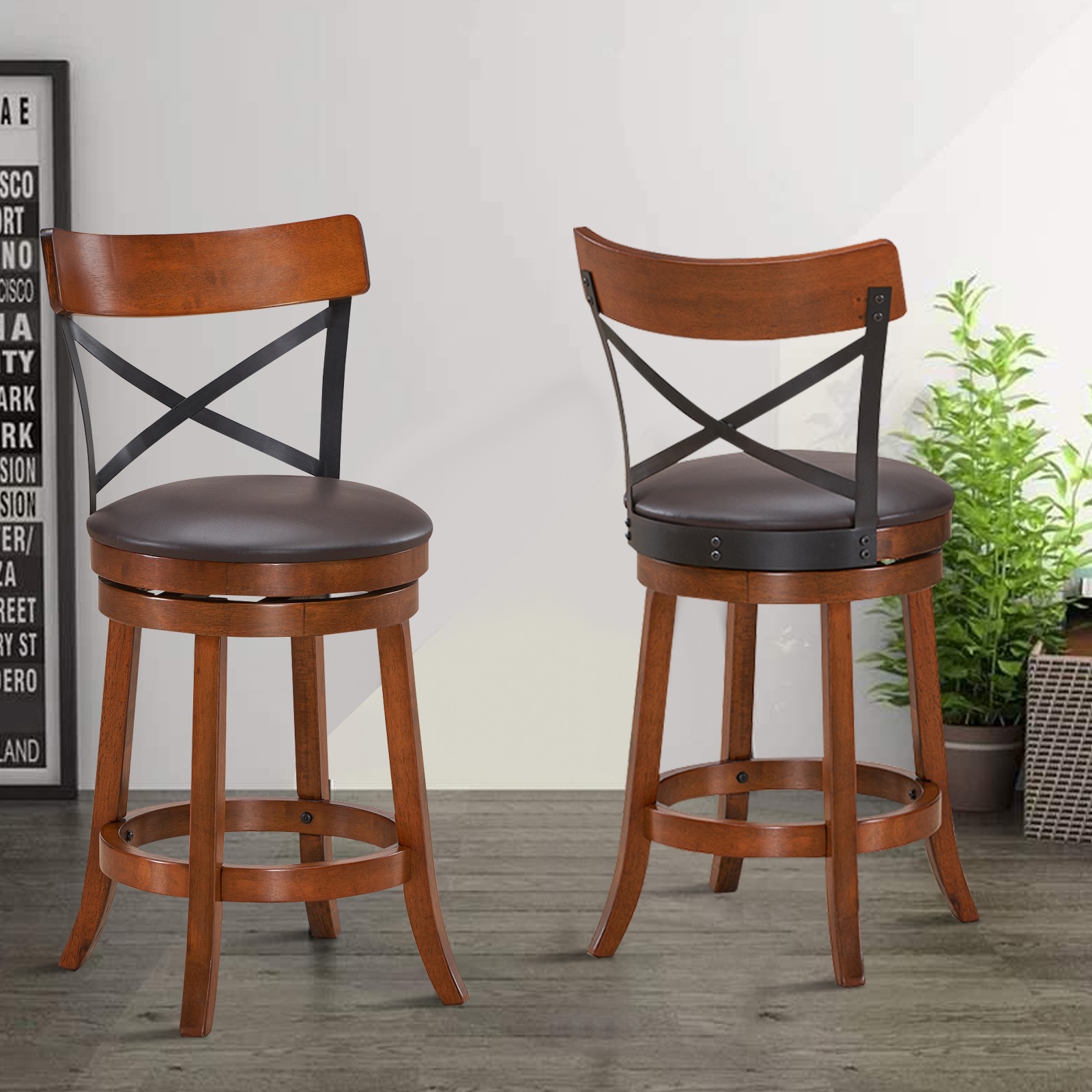 Costway Set of 2 Bar Stools Swivel 25 Dining Bar Chairs with Rubber Wood Legs