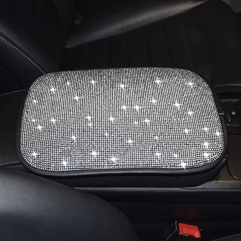 Luxury PU Leather Car Armrest Cover Bling Crystal Rhinestone Universal Fit Decor