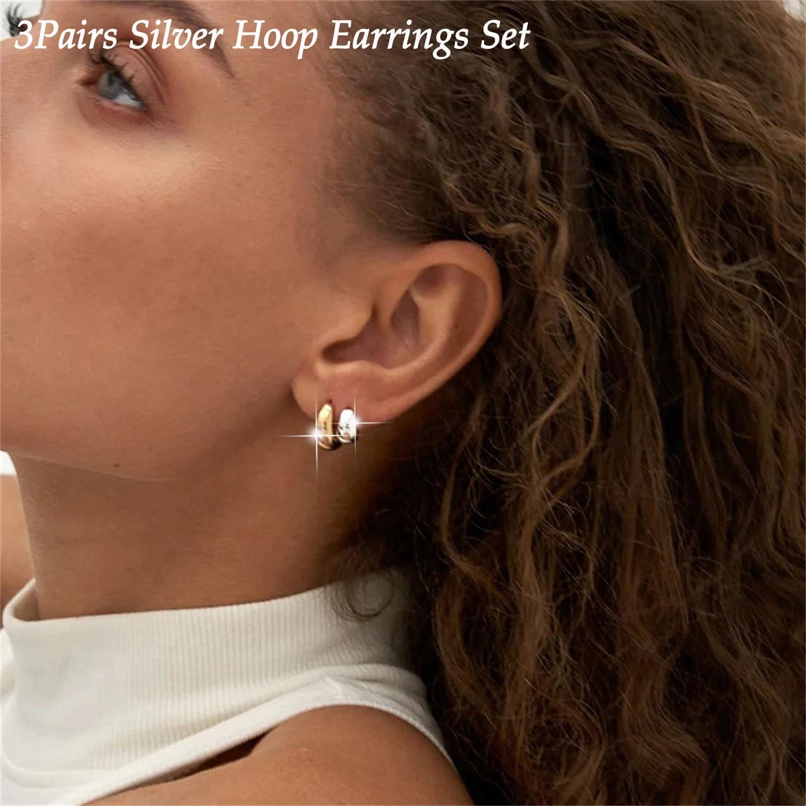 как выглядит 3Pairs Hoop Earrings Set for Women,Small Chunky Huggie Earrings Lightweight Thic фото