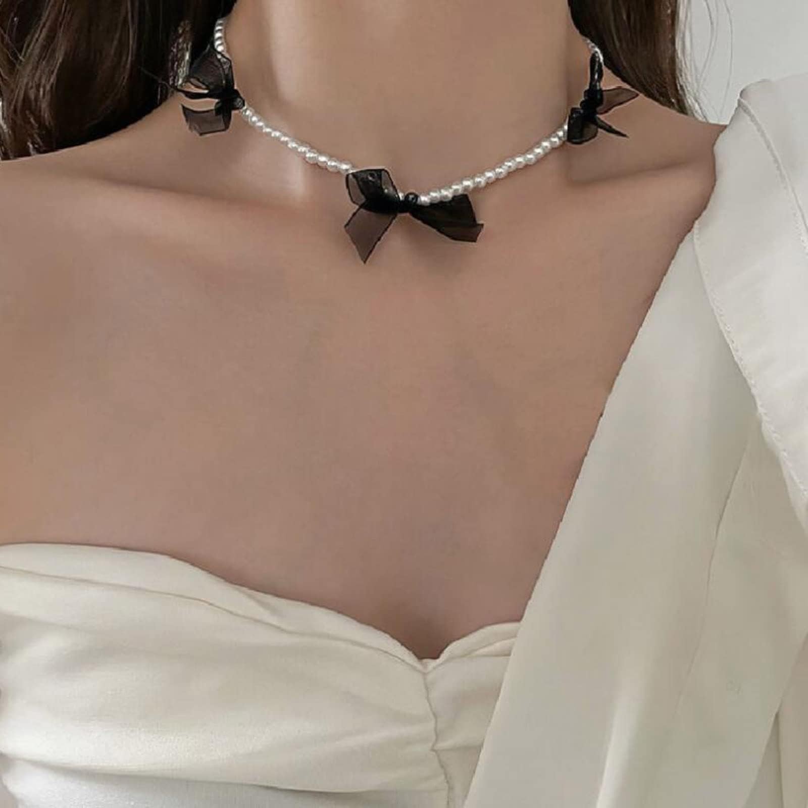 Bohemian Pearl Bow Pendant Necklace Black Bow Tie Choker Necklace Pearl Necklace