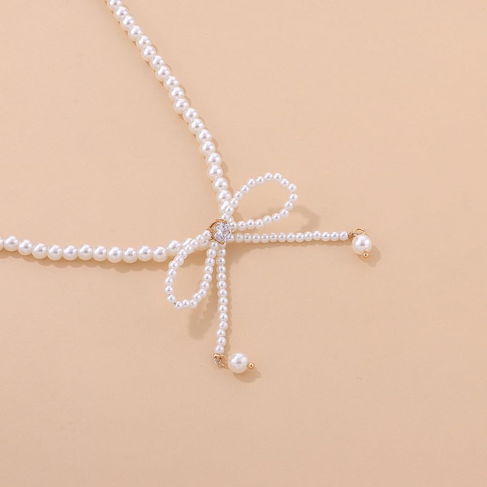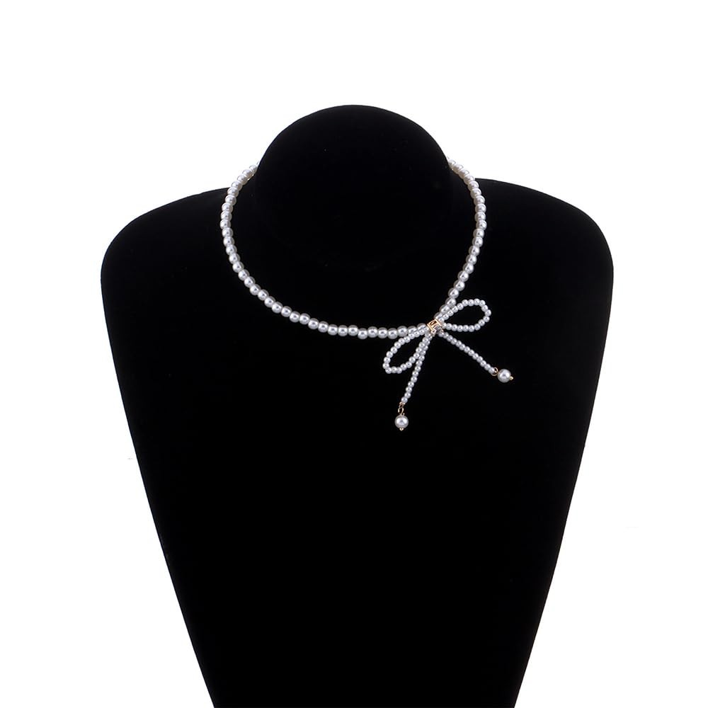Dainty Pearl Rhinestone Necklace Bow Pearl Chain Choker Necklace White Pearl Bea