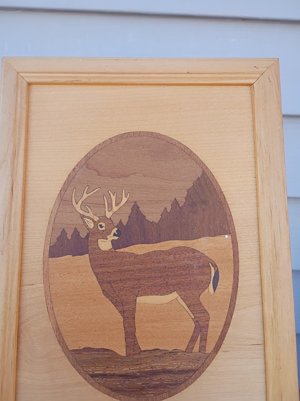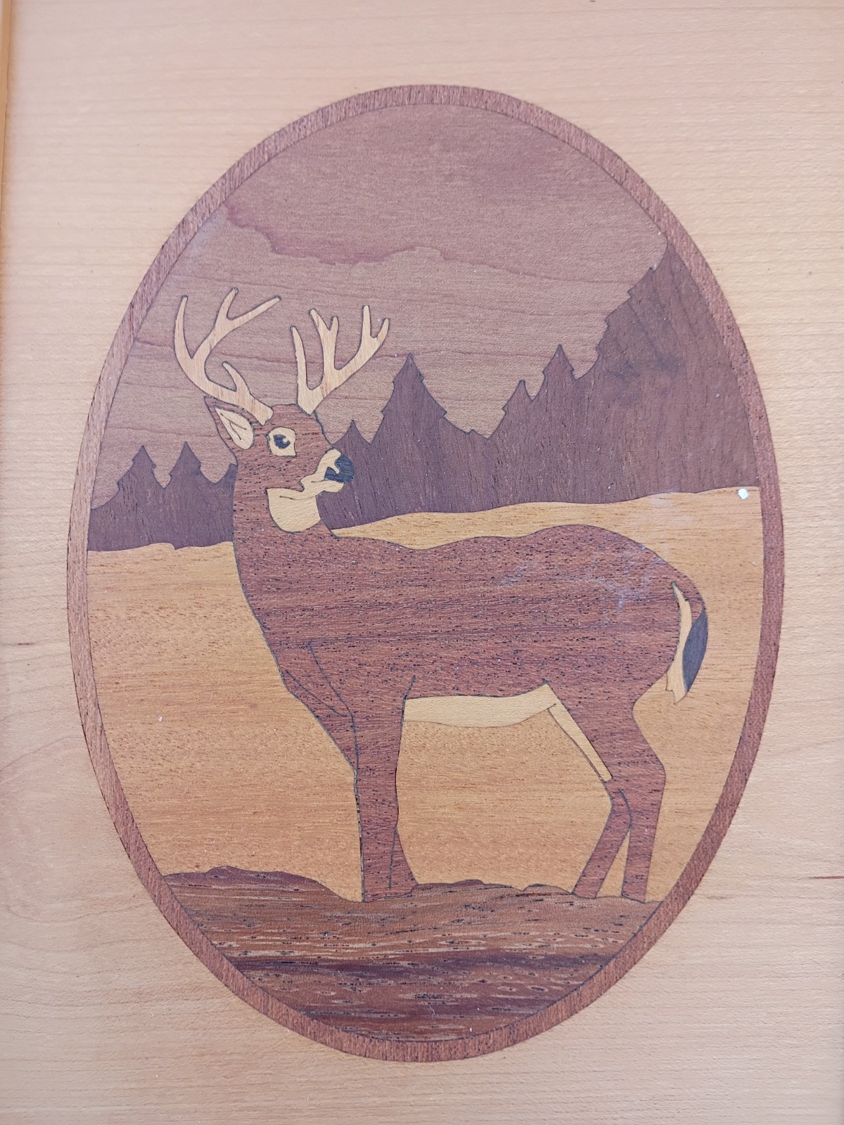 как выглядит Hudson River Inlay Marquetry Art Deer in Forest signed Nelson 10" x 7" фото