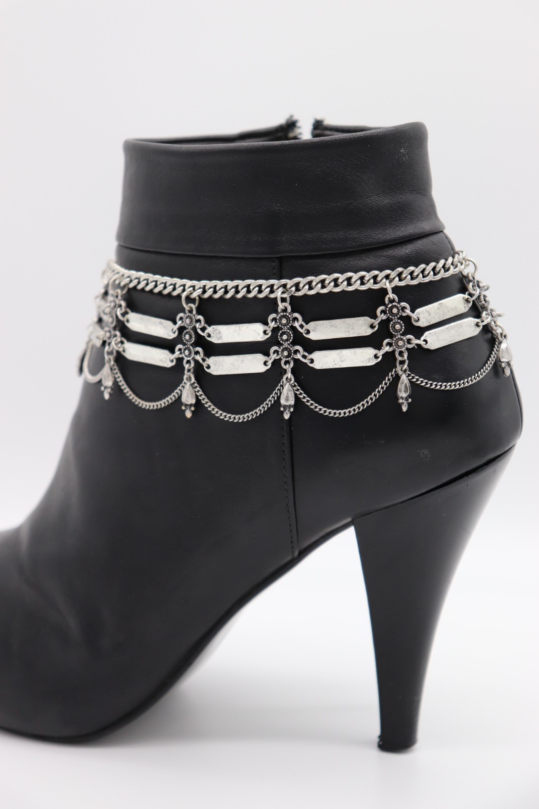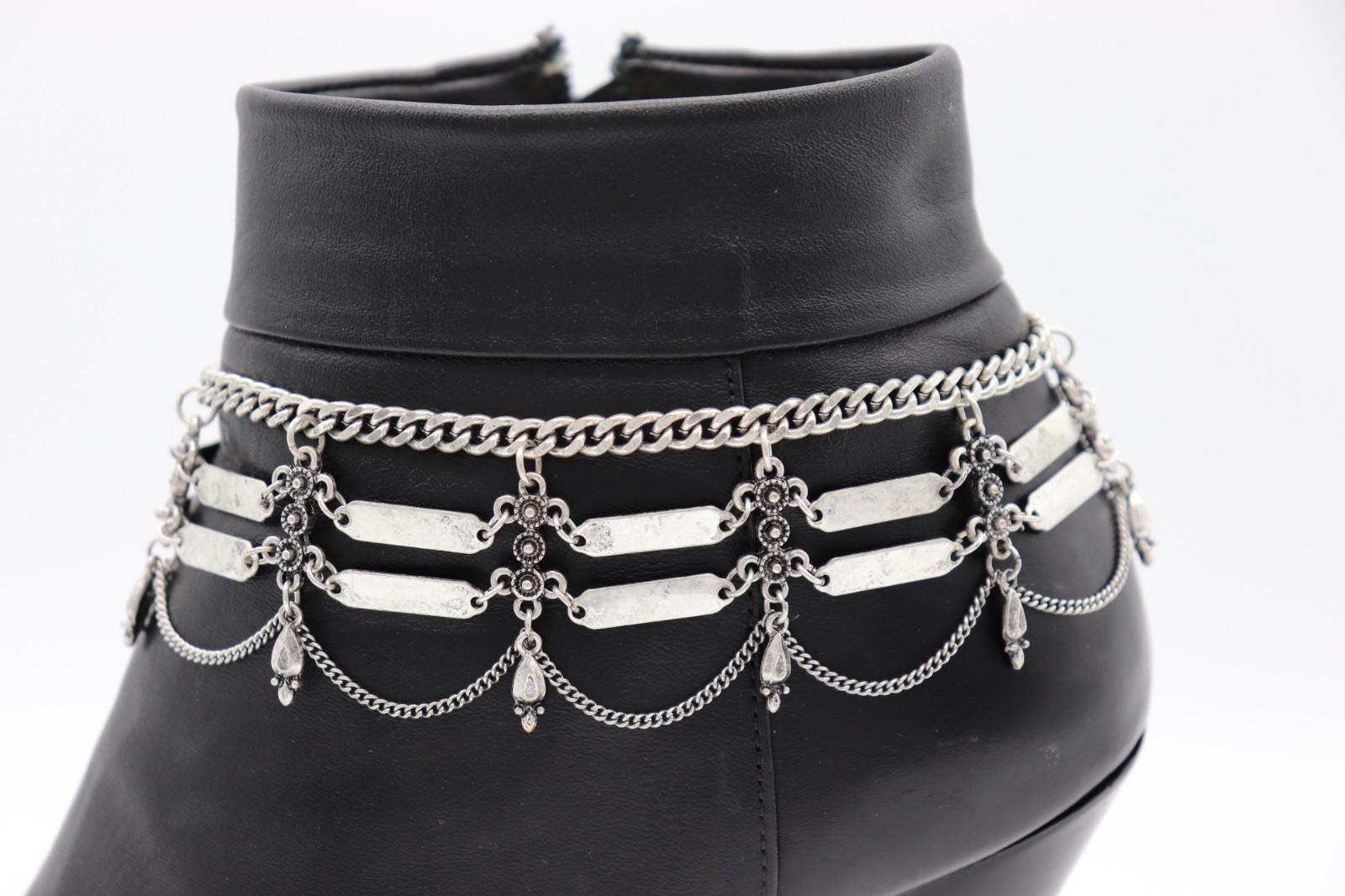 как выглядит Women 2PCS Silver Metal Boot Chain Bracelet Rustic Flower Charm Shoe Anklet PAIR фото