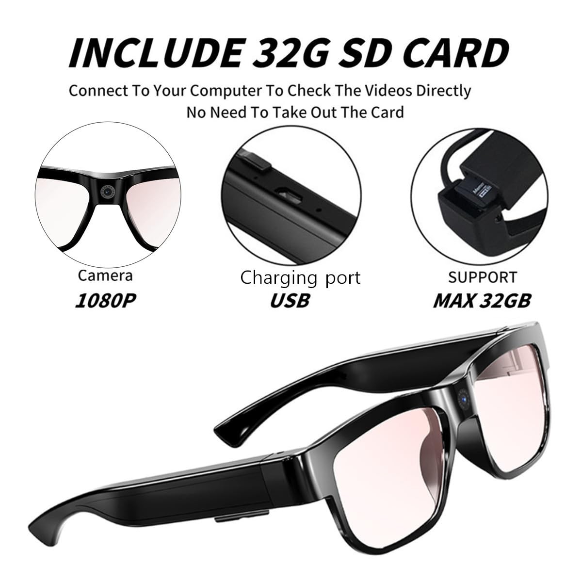 Smart Video Glasses with Camera, 32GB Memory, for Outdoor Sports Hiking