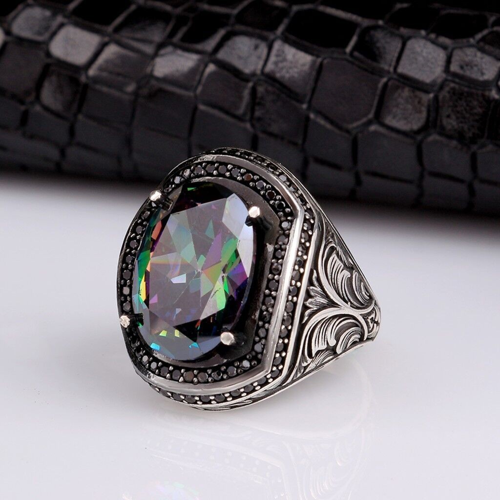 Mystic Topaz Stone 925 Sterling Silver Men's Ring Turkish Handmade Jewelry
