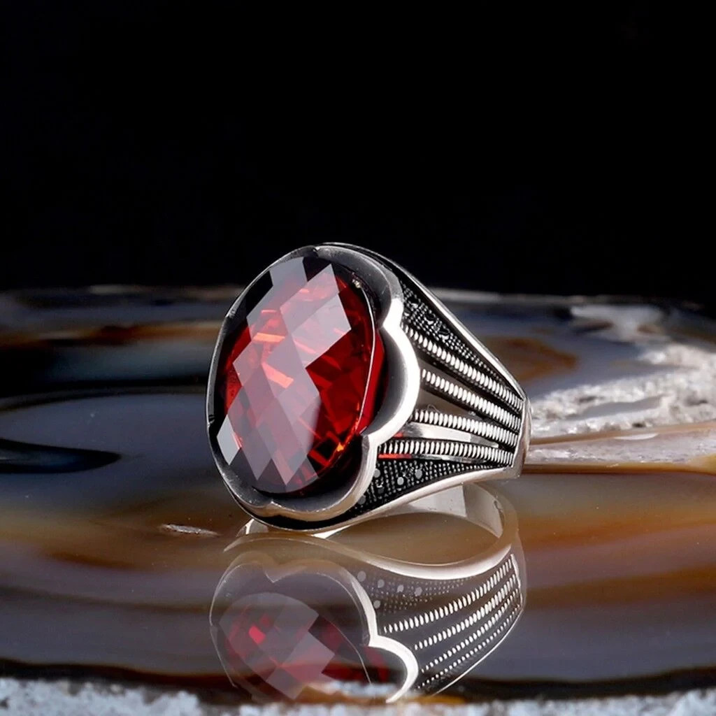 как выглядит Faceted Red Zircon Stone Sterling Silver Mens Ring Turkish Handmade Jewelry фото