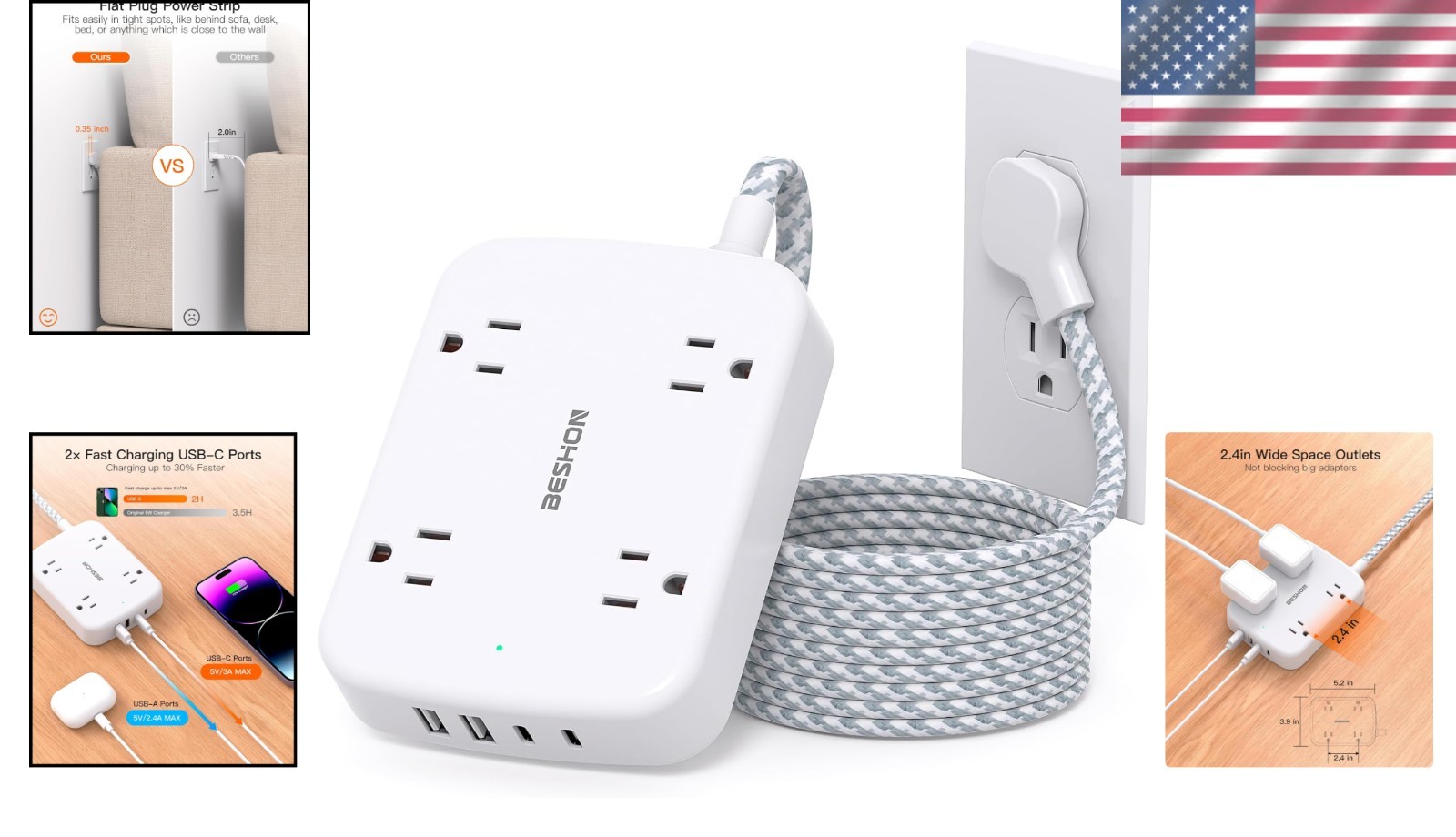 Особенности: USB Port, Surge Protection, Overload Protection, Flat Plug, USB Charging Ports, Durable, Braided Power Cord, Environmental Protection, Certified, Short-Circuit Protection, Over Current Protection, Over-Voltage Protection, Overheating Protection, Flame Retardant Shell