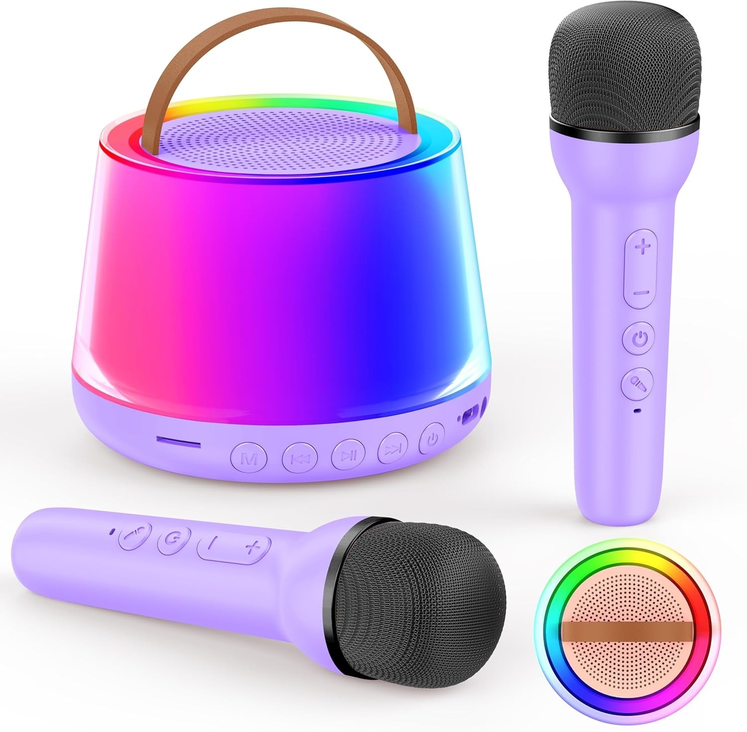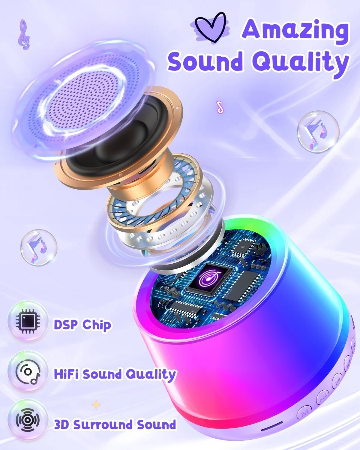 Особенности: Bluetooth, Portable, Bluetooth 5.4, Crystal Clear Sound Quality, Colorful Light Show, Magic Voice Effects, Kid-Friendly Design, Lightweight, Compact