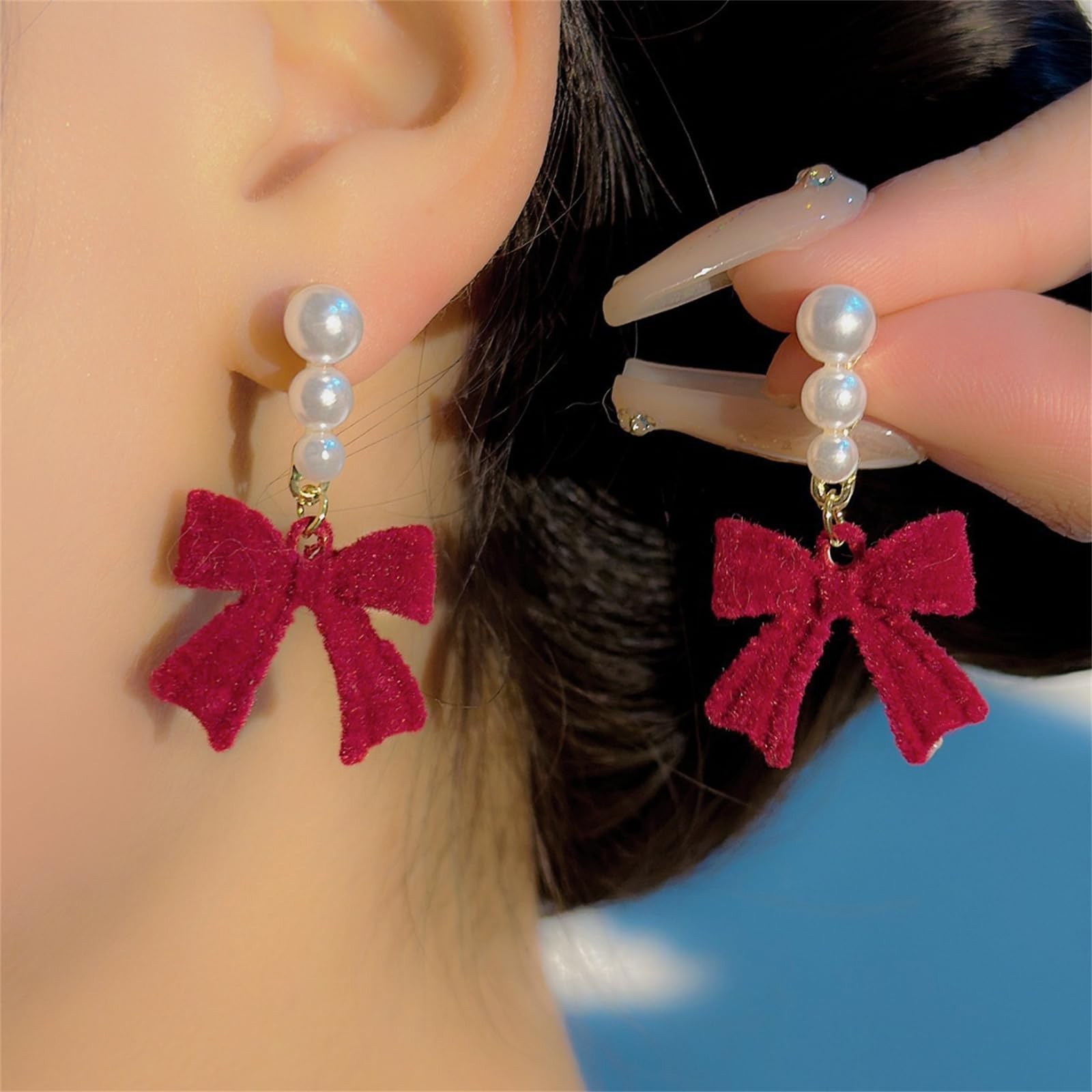 Christmas Bow Earrings for Women Trendy Pearl Red Ribbon Bow Stud Earrings Weddi