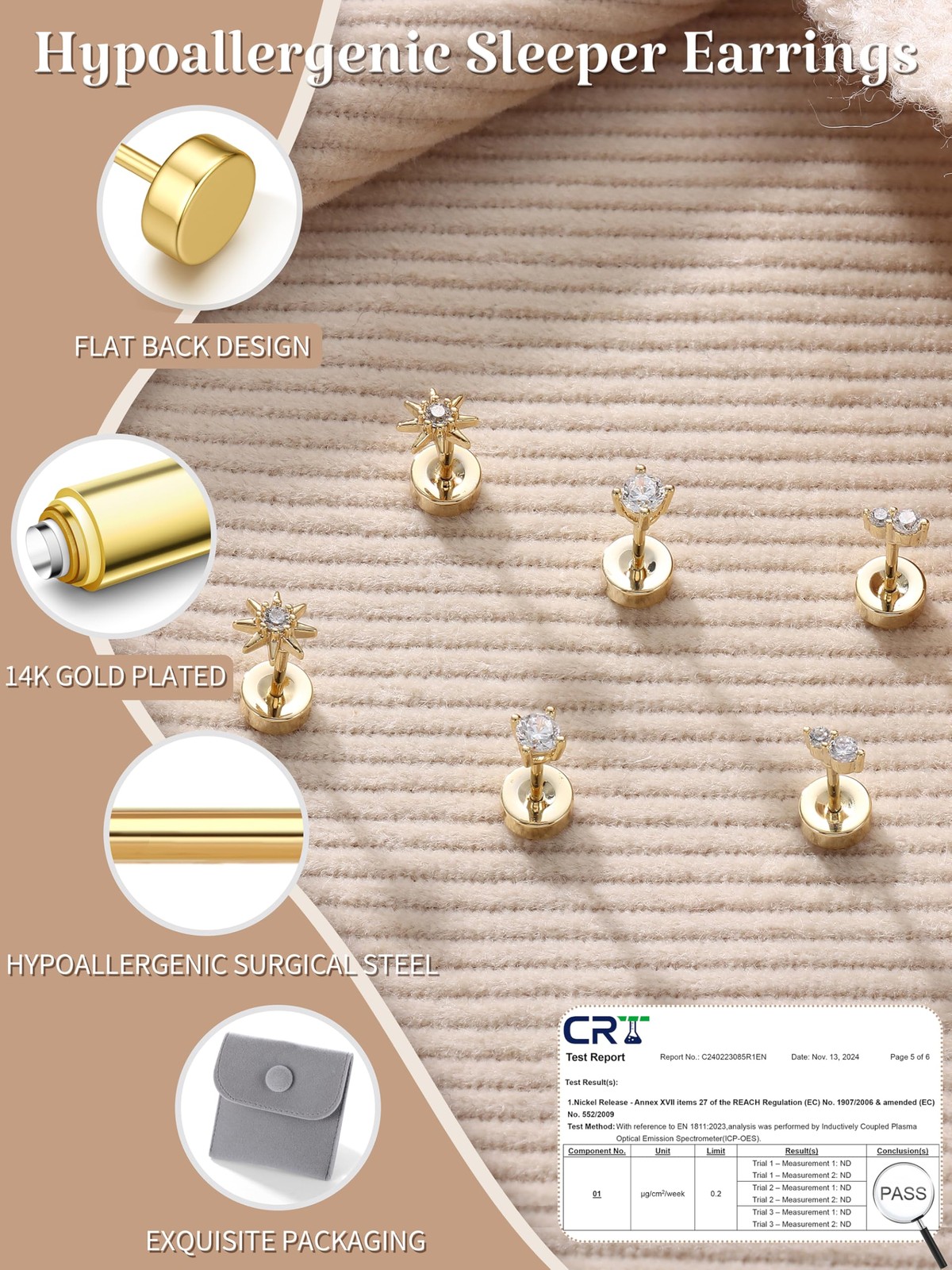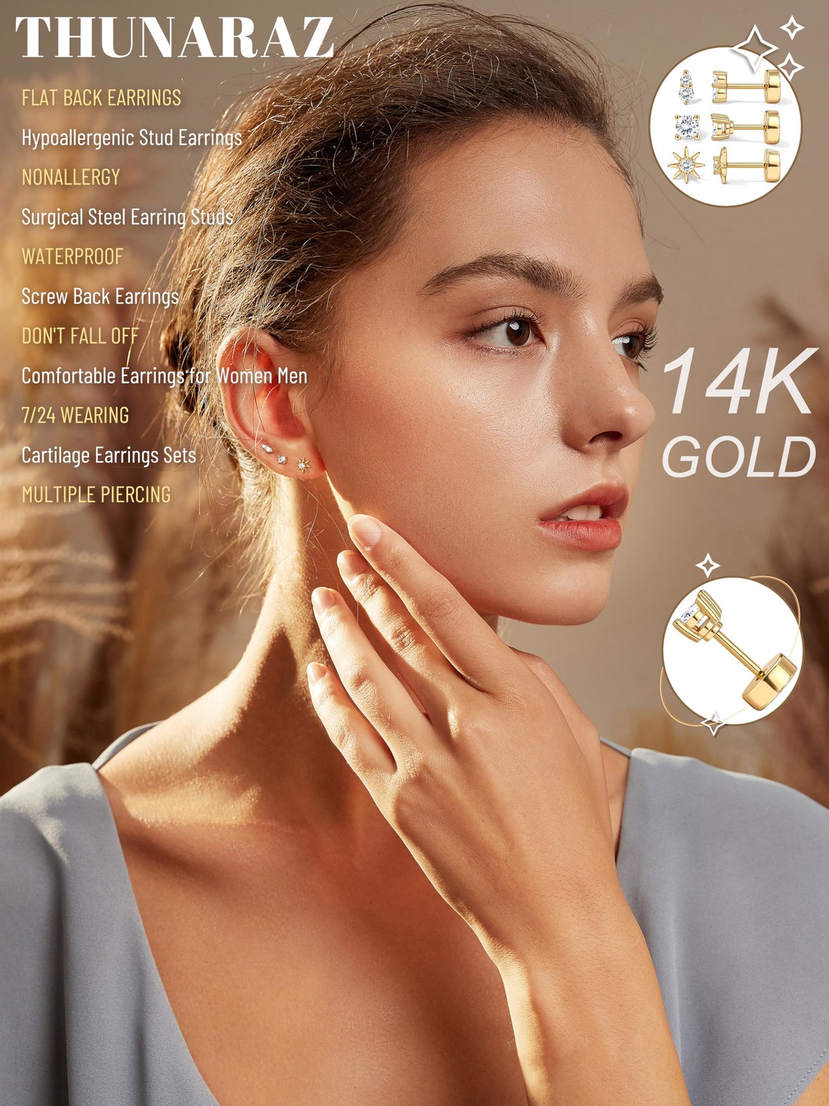 14K Gold Flat Back Earrings for Women Men Dainty Hypoallergenic Surgical Stainle
