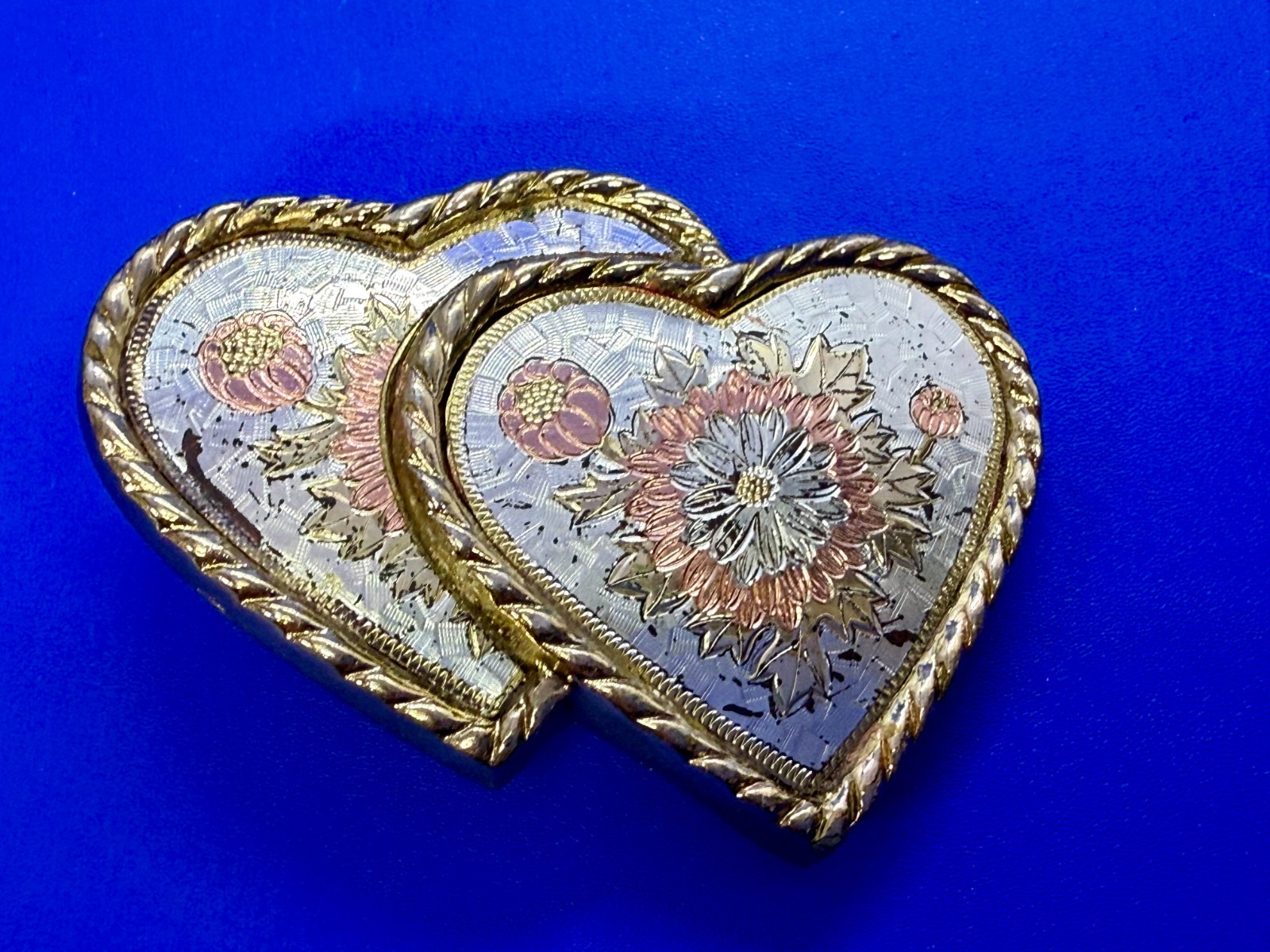 Two Heart Shaped Flower Etched Floral Western Ladies Small Belt Buckle - W USA