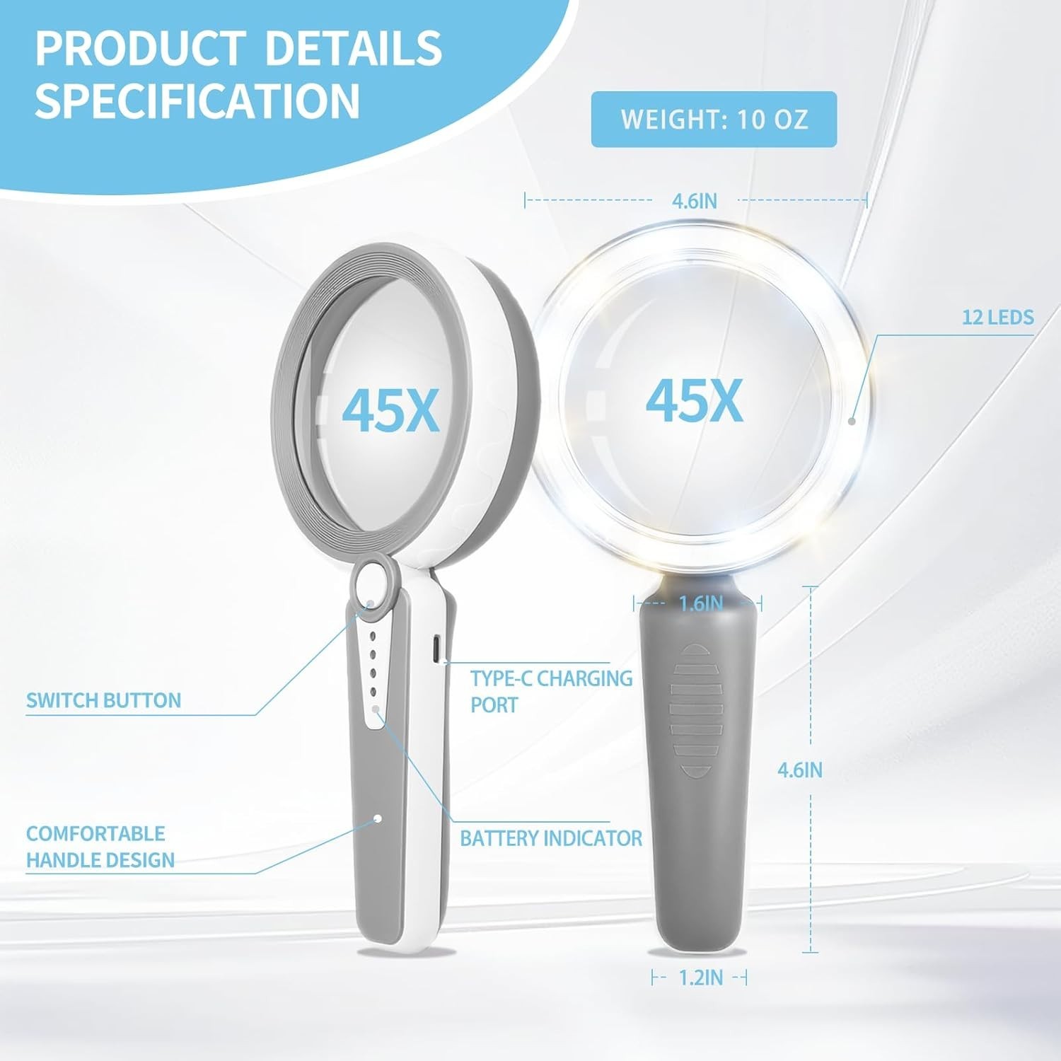 45X Magnifying Glass w/ Light, 4.6 Inch 1200mAh USB Rechargeable for Low Vision