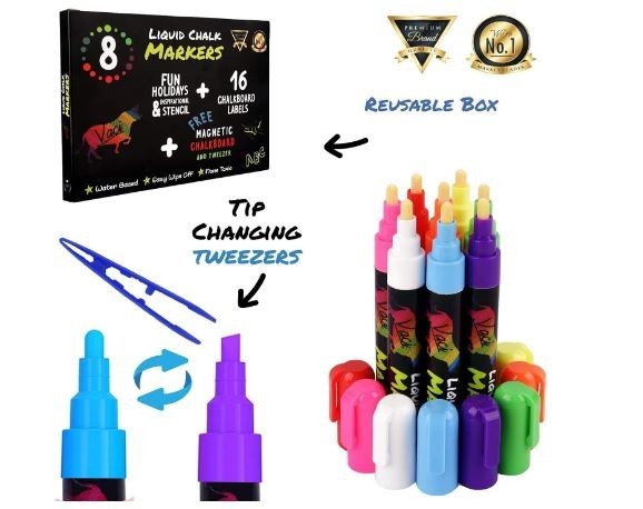 8 Multicolored Liquid Chalk Markers Erasable, Non-Toxic, PLUS Accessories