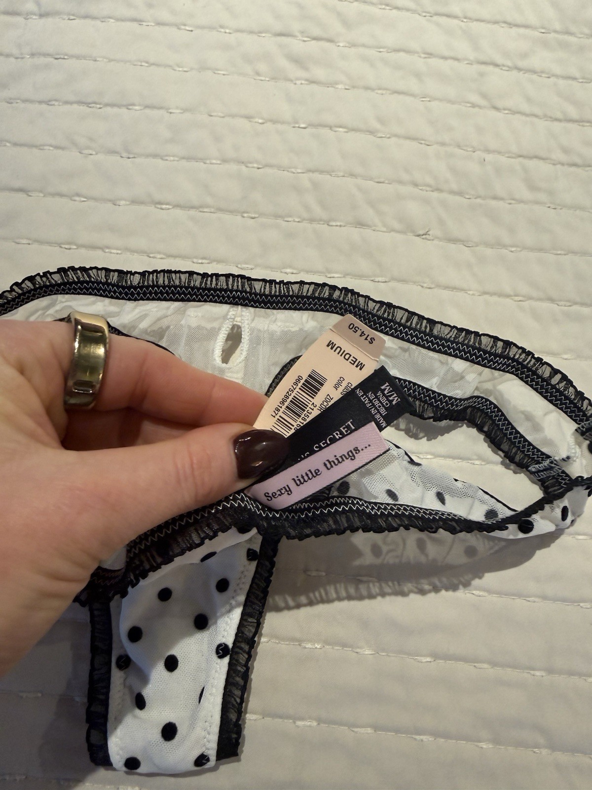 как выглядит Victorias Secret NWT VINTAGE Medium white w/ black polka dot lace sheer thong фото