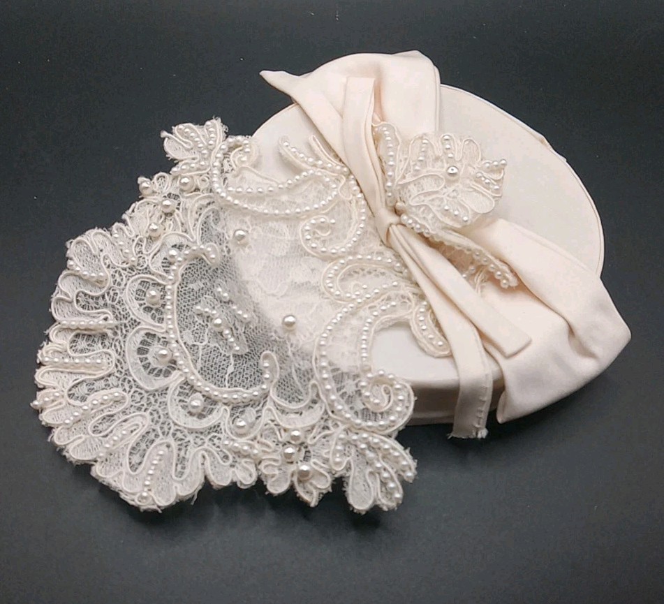 Victorian Bridal Headpiece box Cap Lace Pearl Embellishments Veil Ivory wedding