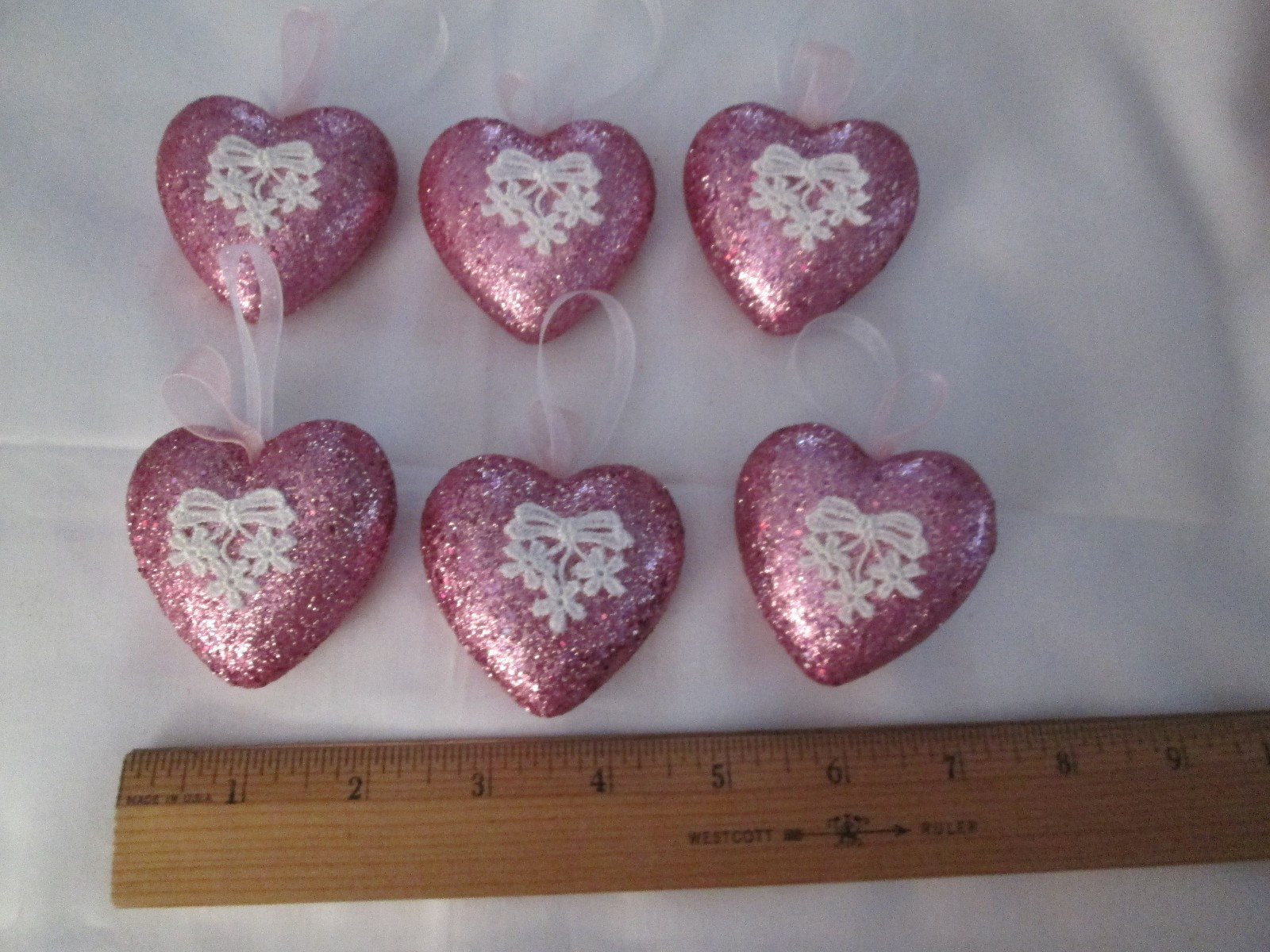 как выглядит 6 Elegant Pink Glitter Lace Heart Valentines Day Ornaments, appx. 2.5" NEW фото
