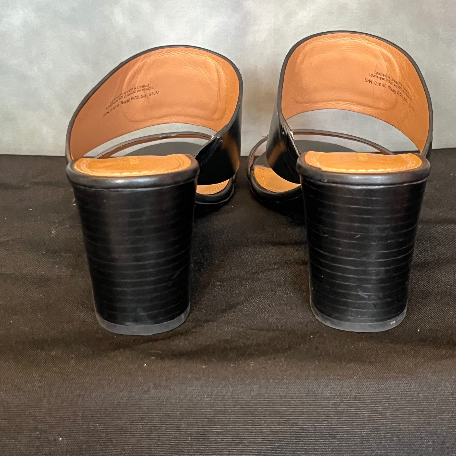 Tory Burch Everly Black Leather Wedge Mules Gold Logo Women US 8.5