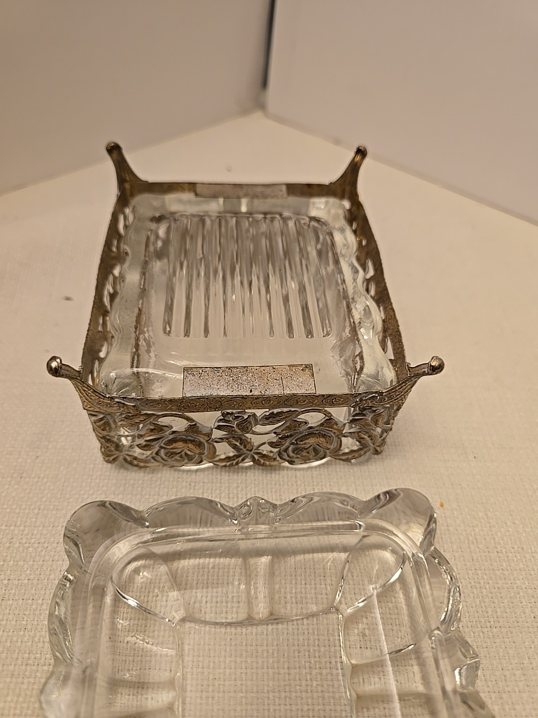 как выглядит Vintage Vanity Heavy Glass Floral Filigree Footed Trinket Box фото