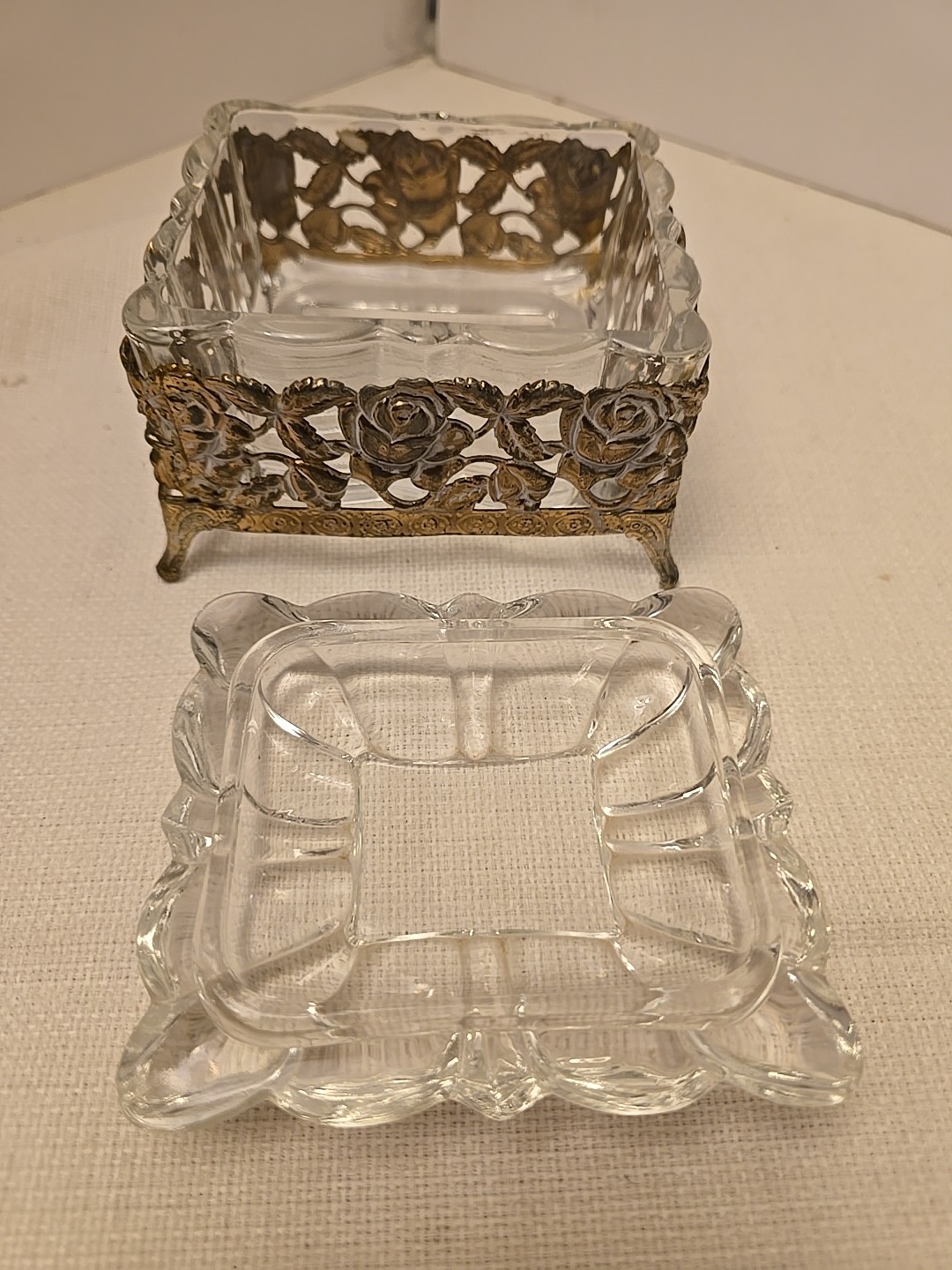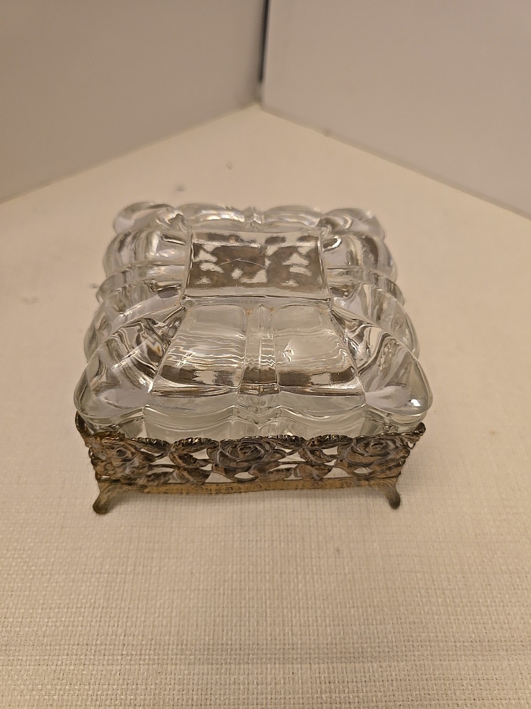 • Vintage Vanity Heavy Glass Floral Filigree Footed Trinket Box