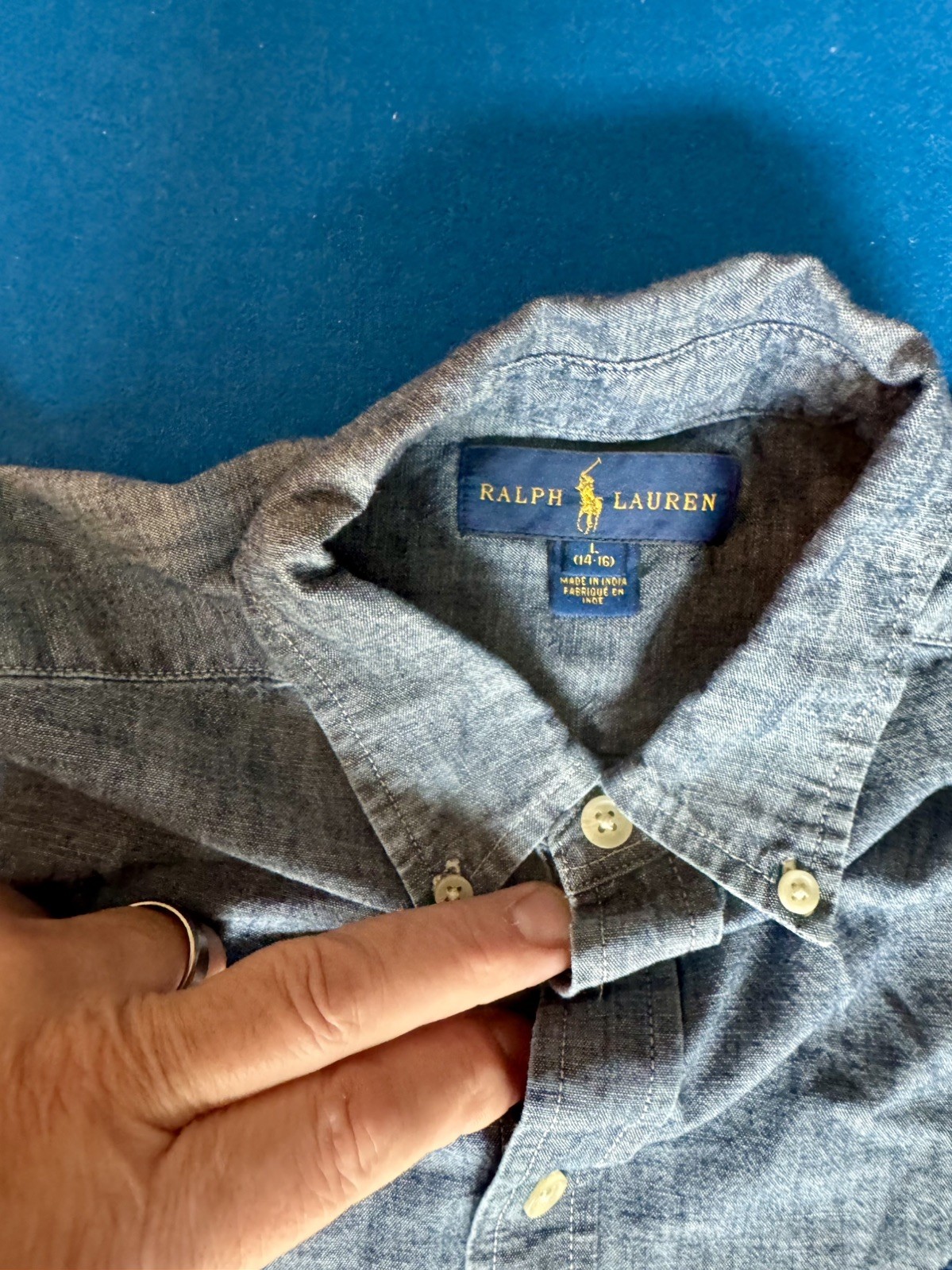как выглядит Ralph Lauren Boys L 14-16 Blue Chambray Button Down Long Sleeve Shirt, Pony Logo фото
