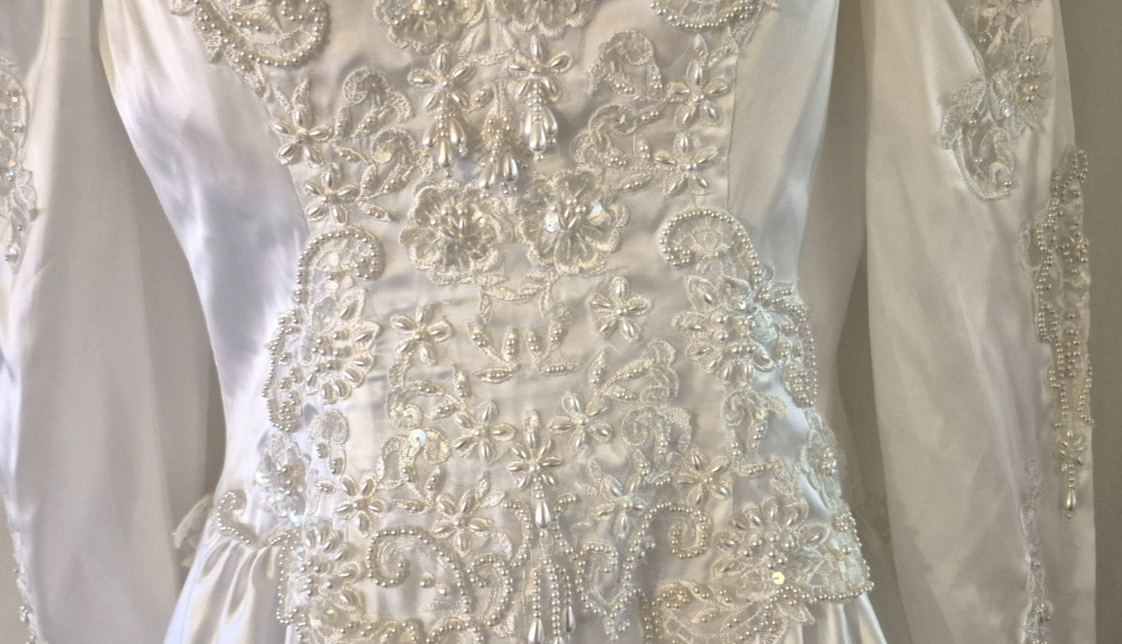 Vintage 90s Wedding Dress ,Satin, Lace Bead Work Long Train Size 12