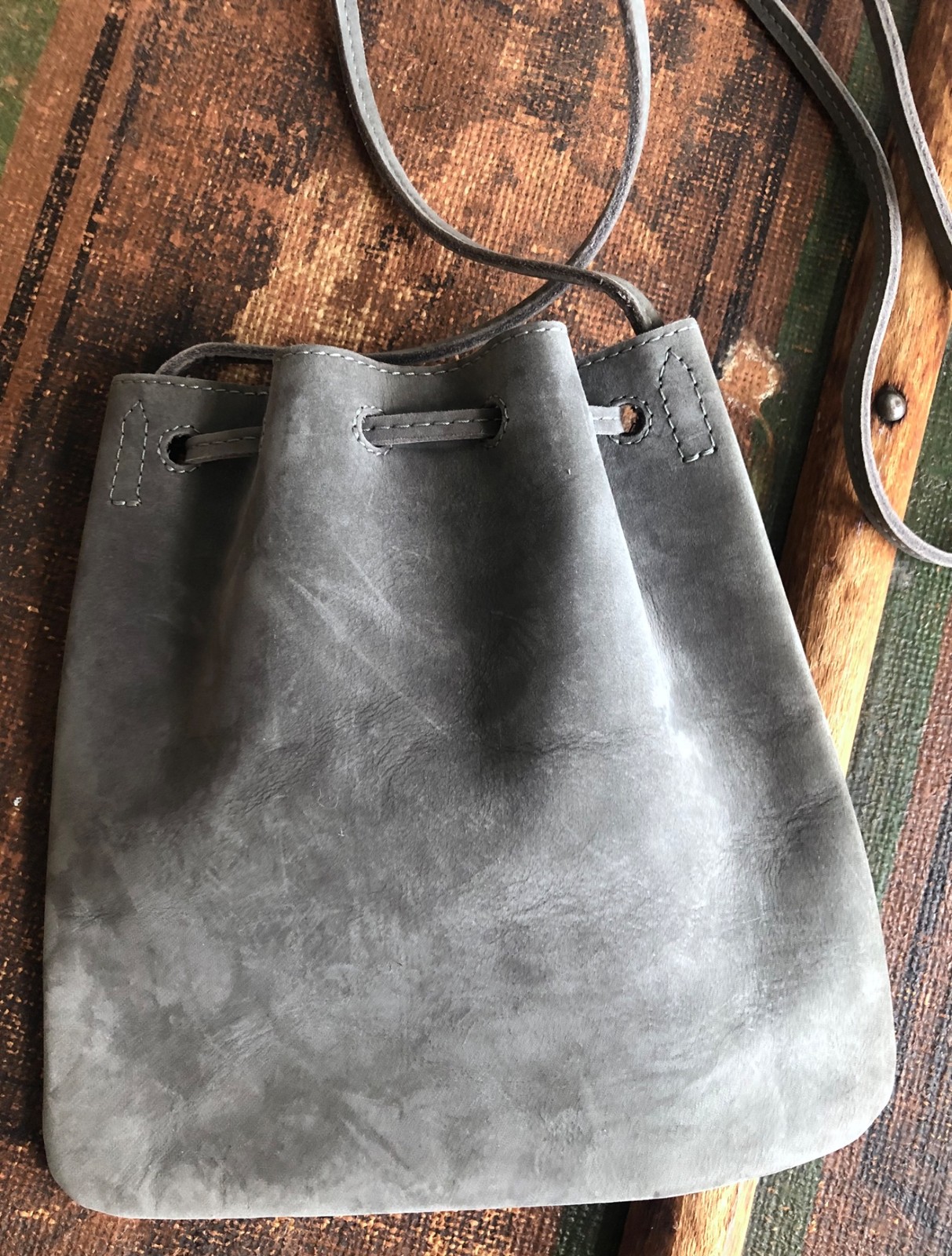как выглядит D/E GOODS 225 DRAWSTRING POUCH BAG PURSE SANDED LEATHER DARK GRAY EUC CLEAN фото