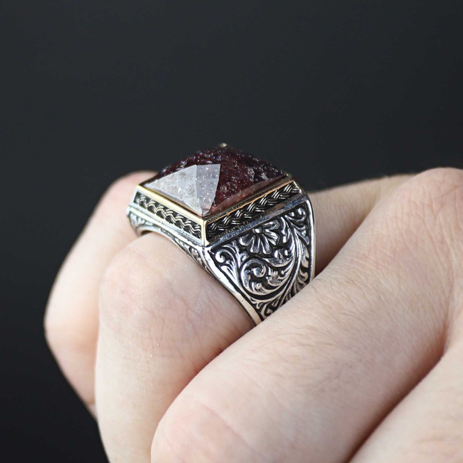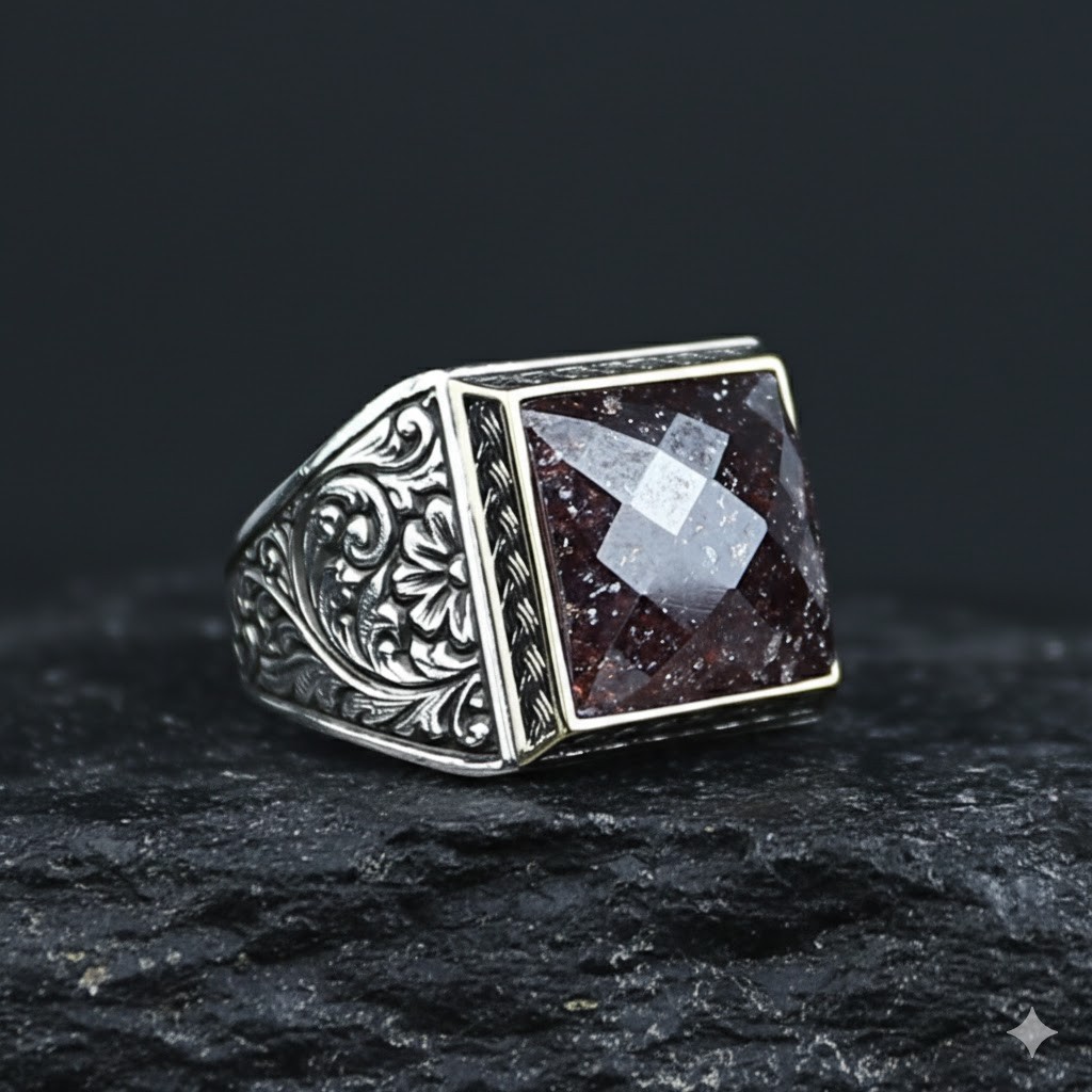 925 Solid Men Silver Red Garnet Stone Red Gemstone Engraved Men Ring