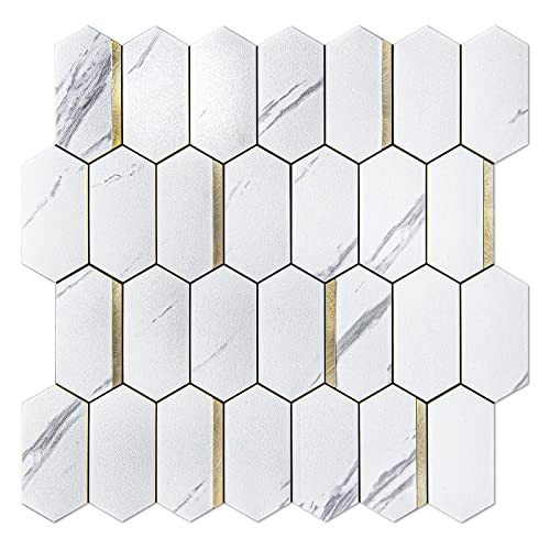 10-Sheet Hexagon Tile Peel and Stick 10 Pack White Marble with Gold Metal