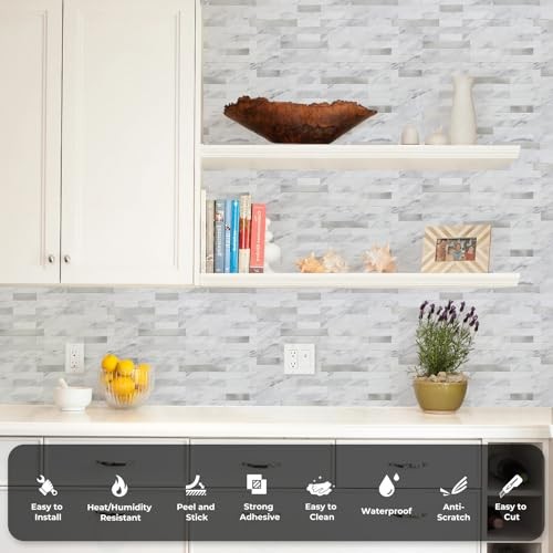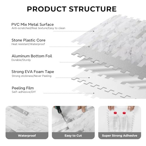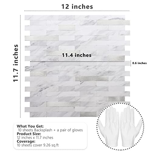 Peel and Stick Backsplash, PVC Wall Tiles 10 White Marble with Metal Silver