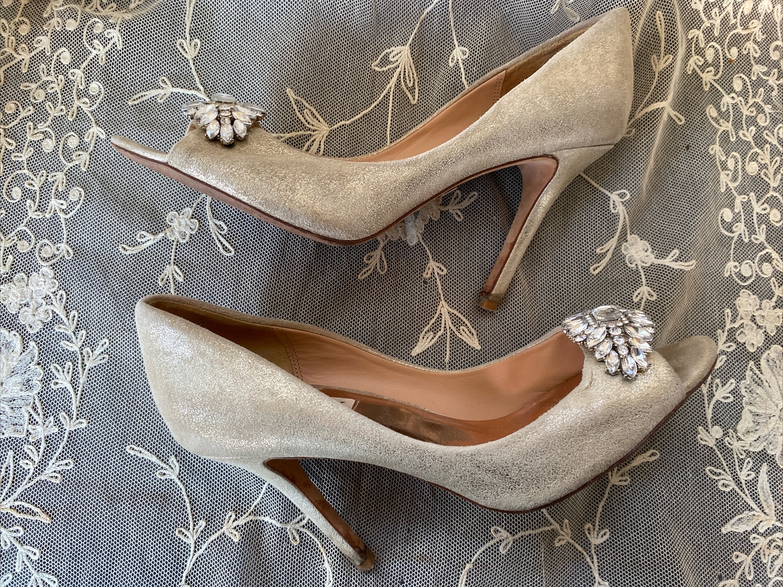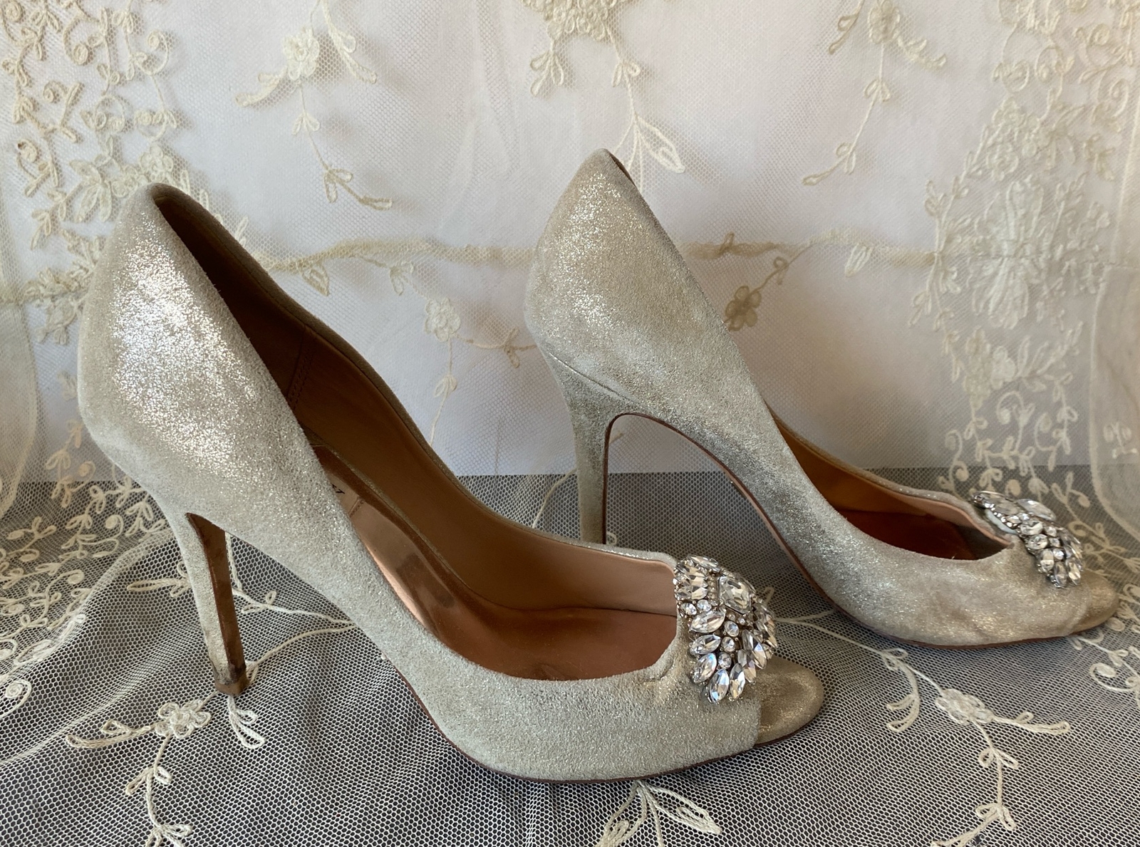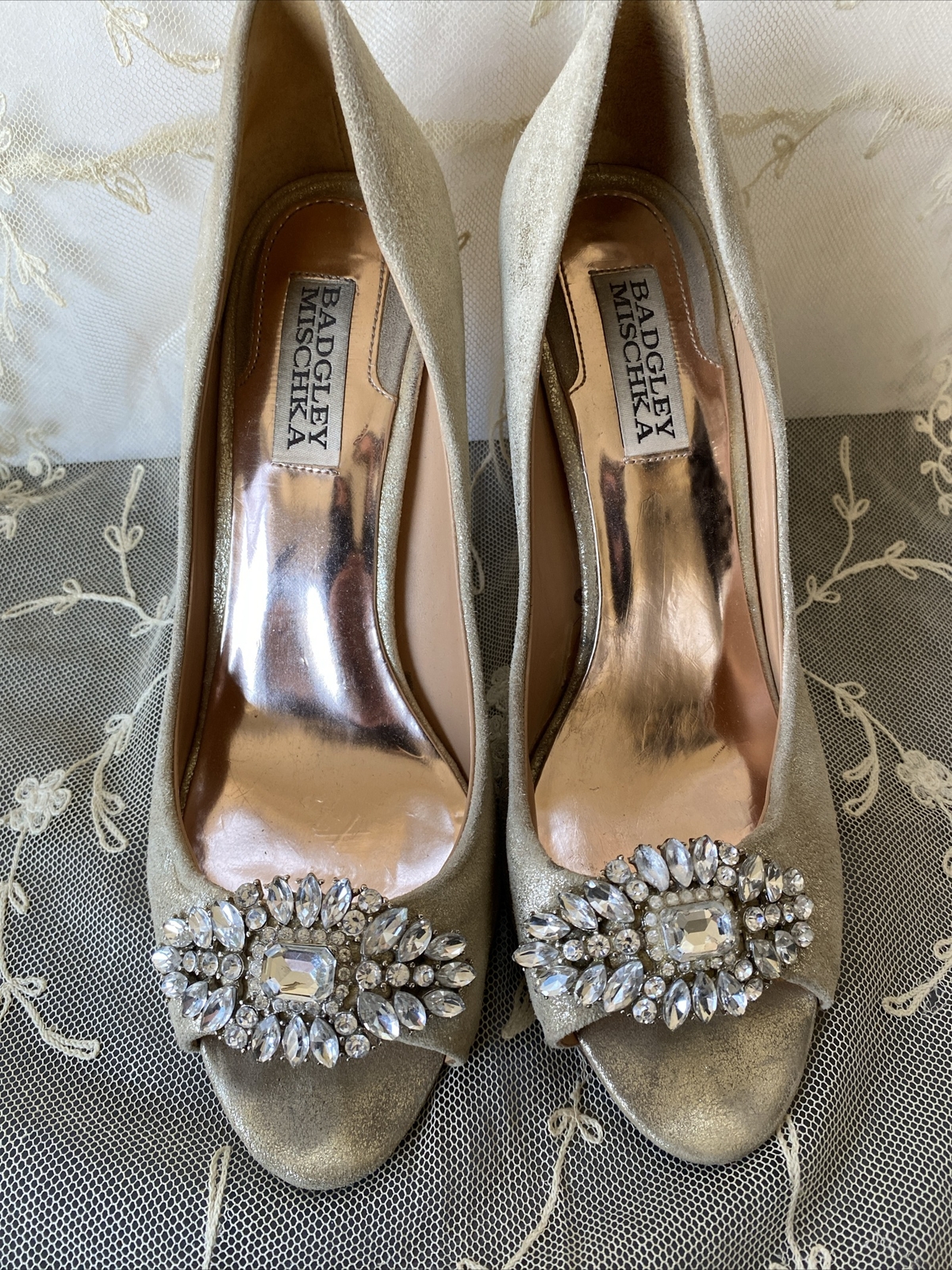 Badgley Mischka Gold Peep Toe 4 Jeweled Brooch Pumps 7-1/2M Leather Sole