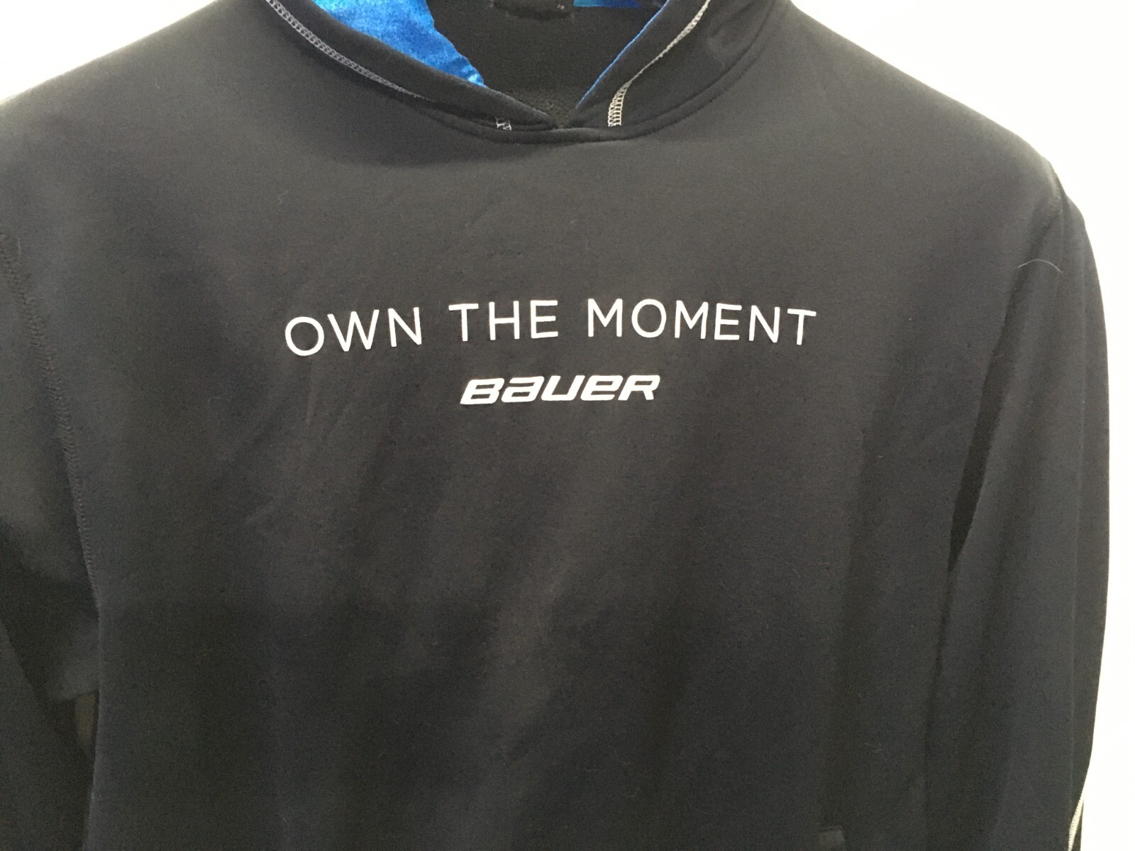 Bauer Hoodie Mens XL BLUE Logo Spellout Own The Moment Hockey rare Pullover EUC