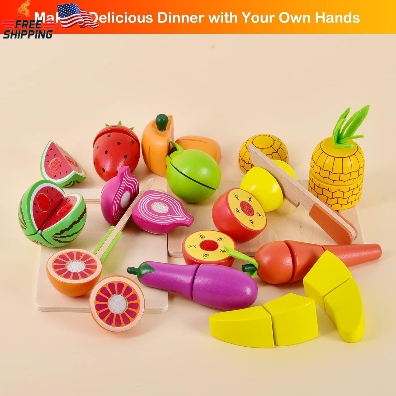35 Pcs Wooden Play Food Set Kids Kitchen Pretend Cutting Food with Tray