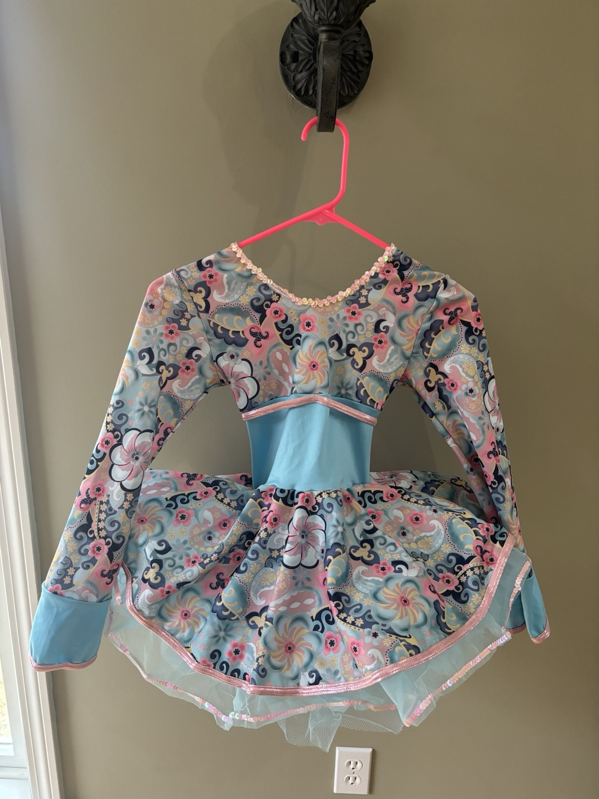 как выглядит Girls Medium Blue Long Sleeve Dance Dress with Tutu and Floral Decoration фото