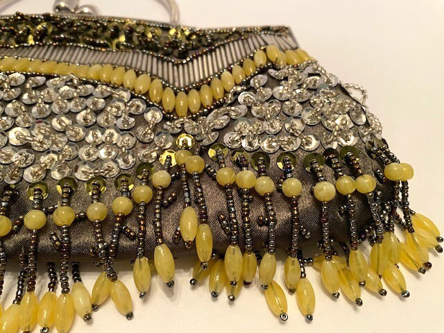 VTG Purple Pearl Earth Tone Beaded/Sequin Silver Trim/Handle Evening/Party Bag