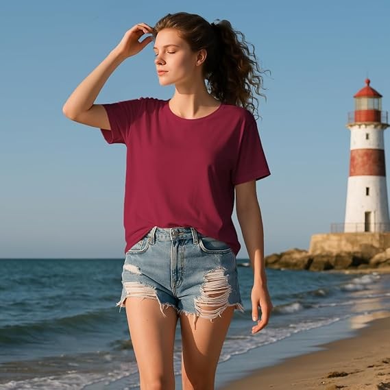 как выглядит Womens Short Sleeve Crew Neck Stylish T-Shirt Solid color S-XXXL Wine Red фото