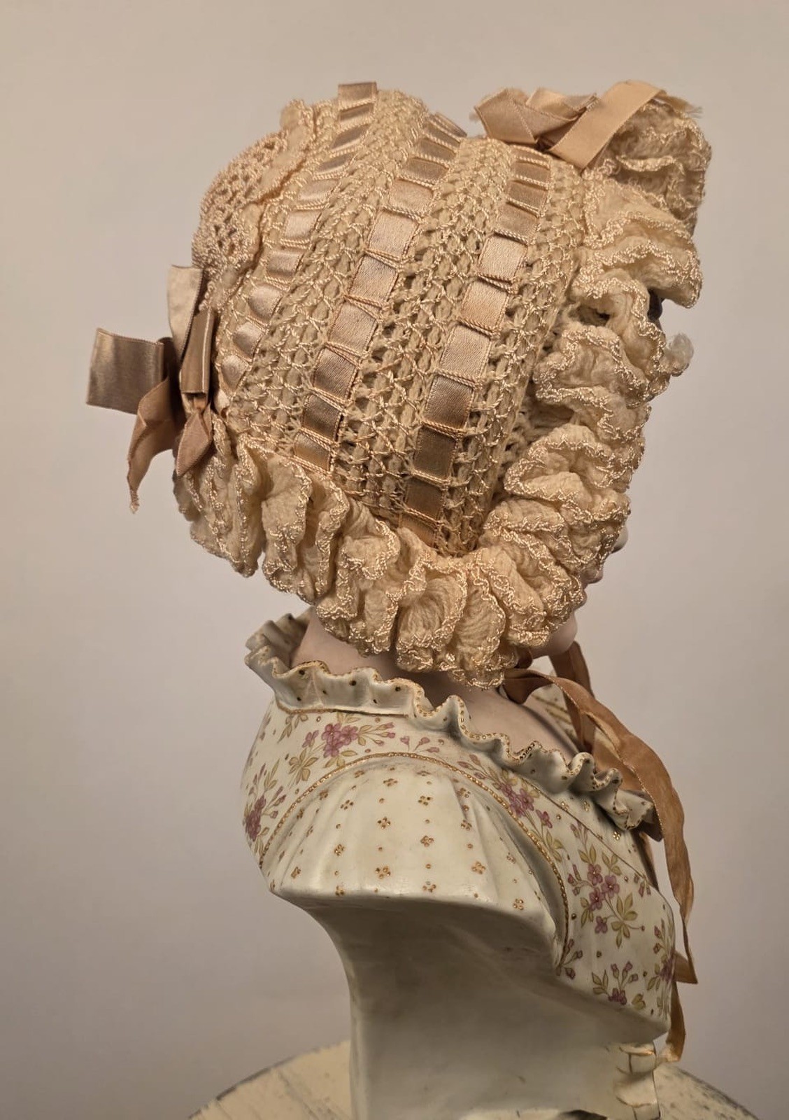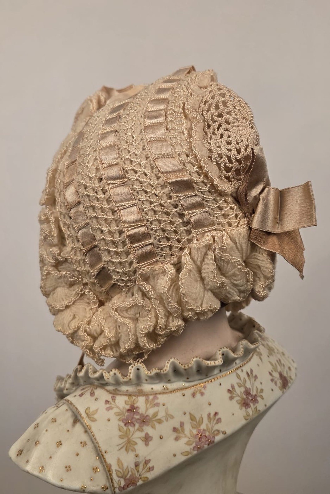 VICTORIAN 19TH C HAND KNIT BONNET W SILK RIBBON WEAVE