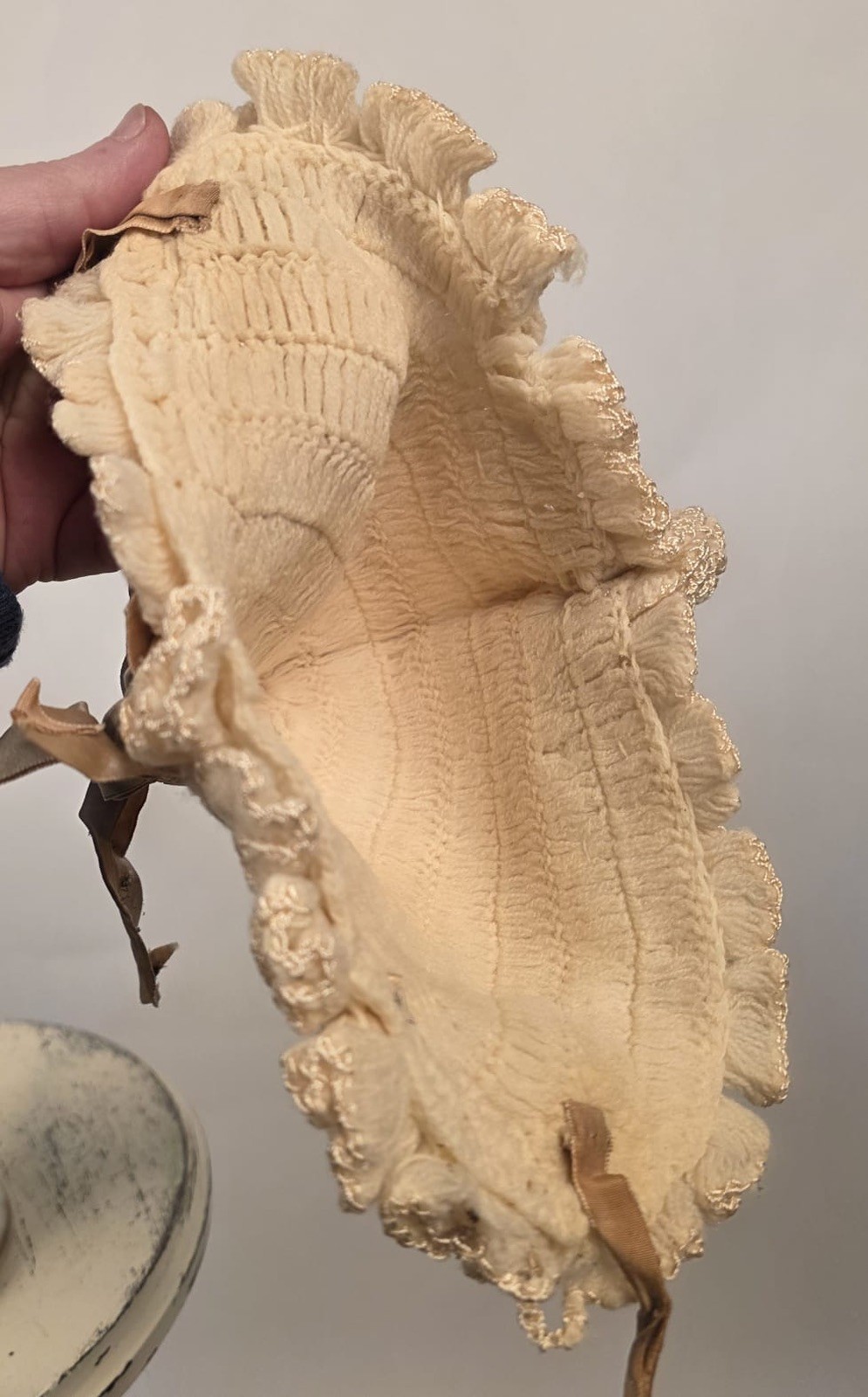 как выглядит VICTORIAN 19TH C HAND KNIT BONNET W SILK RIBBON WEAVE фото
