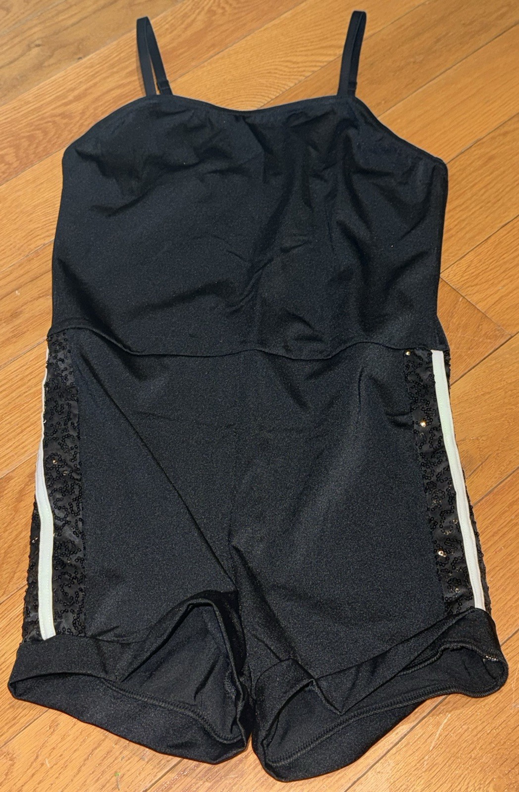 как выглядит Girls XL Weissman black dance costume romper with sequin side panels фото