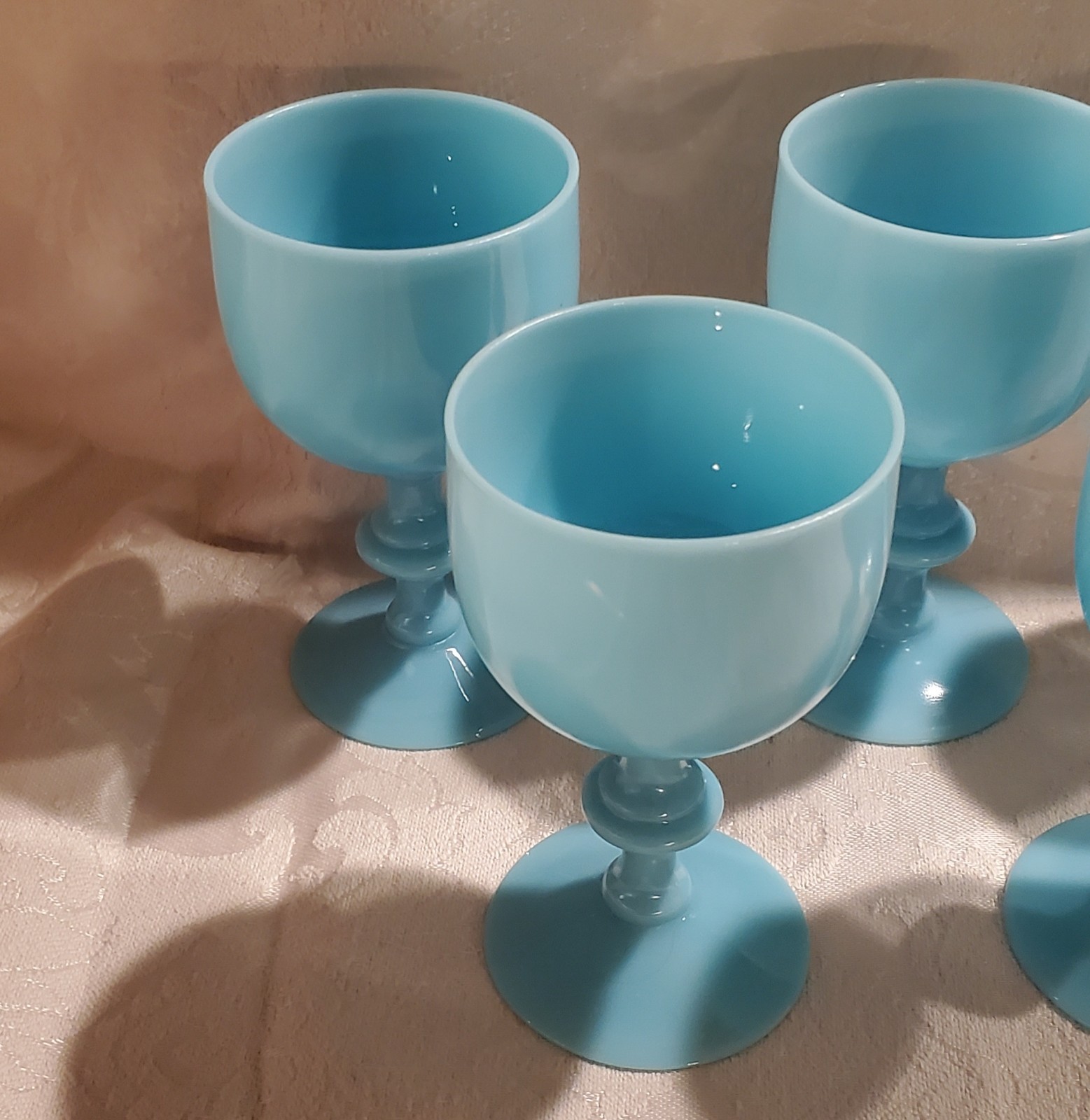 Vintage French Portieux Vallerysthal Blue Opaline Goblets Set Of 5 Mint Cond.