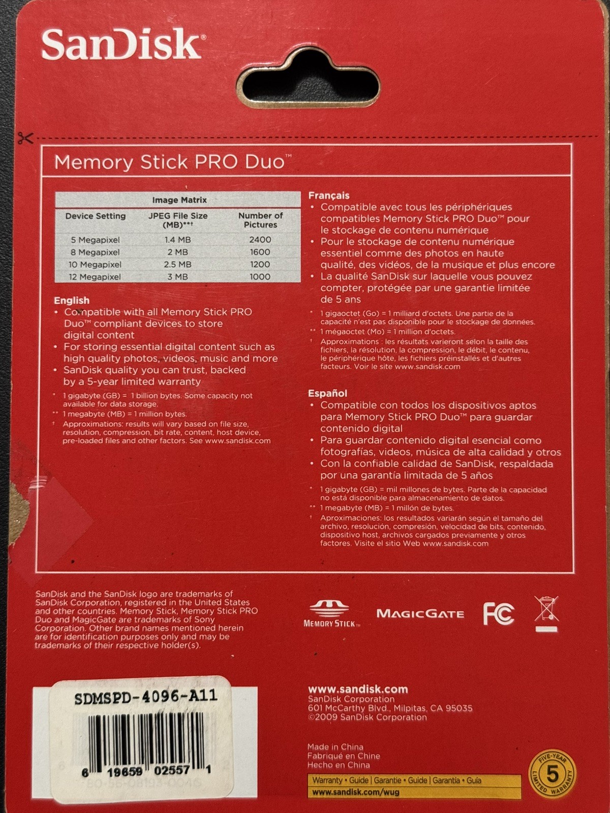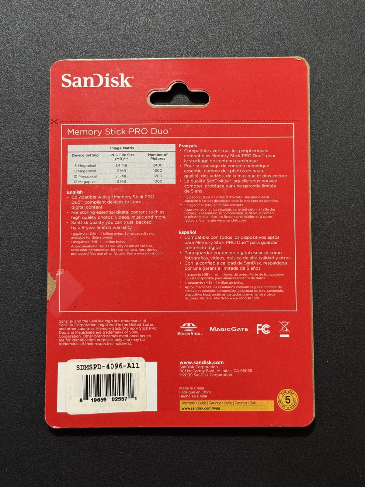 Brand New SanDisk Memory Stick PRO Duo 4GB Made for Sony Products