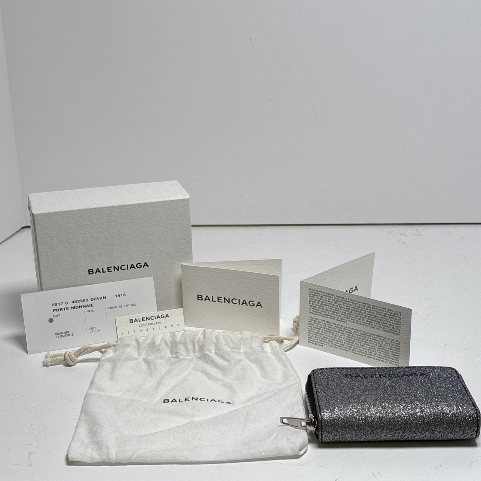 Balenciaga Glitter Leather Zip Card Holder Wallet Silver NEW Full Set