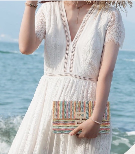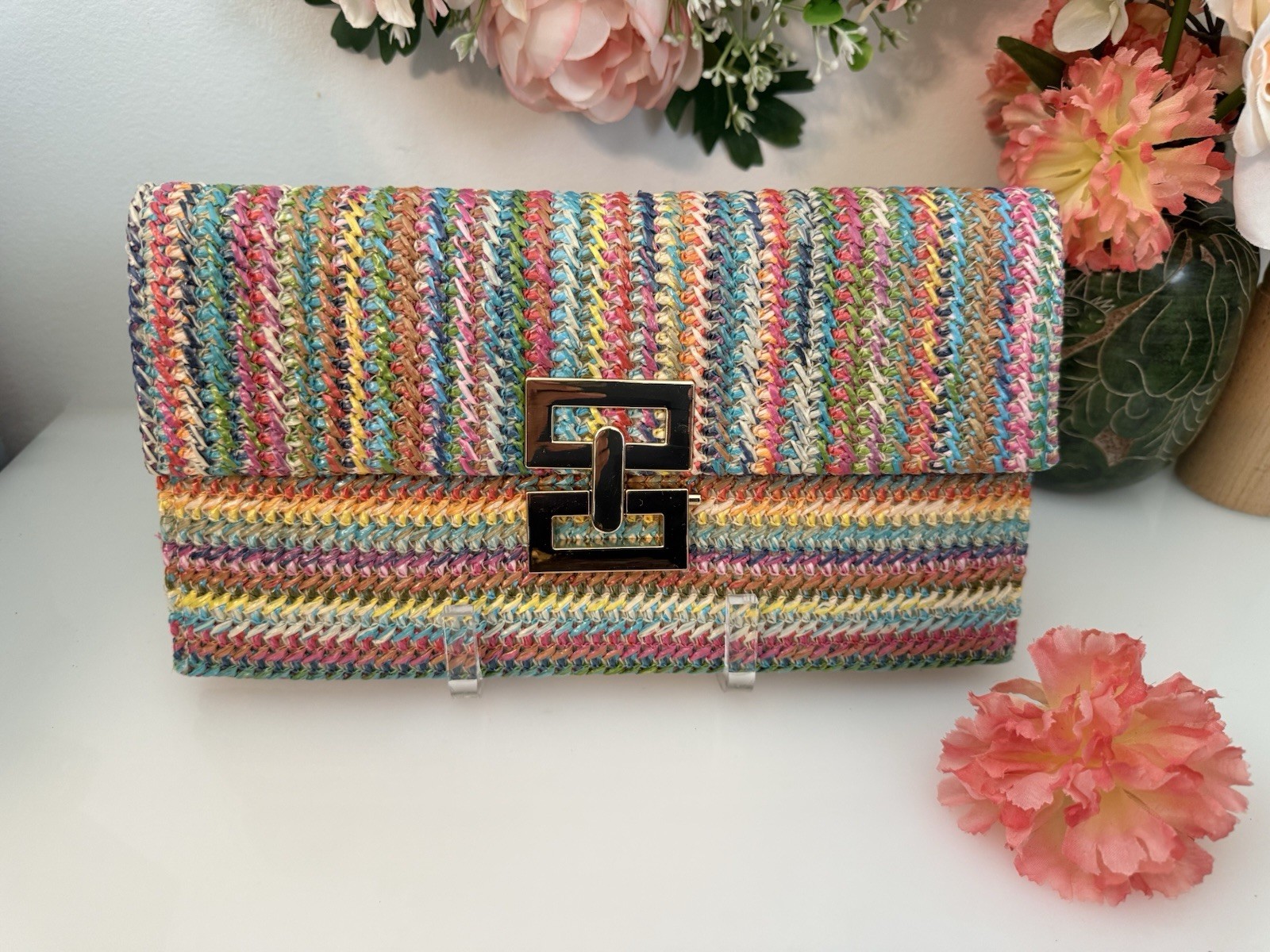 Summer Straw Clutch Purse Woven Beach Bag Evening Purse Multicolor Gold Tone EUC