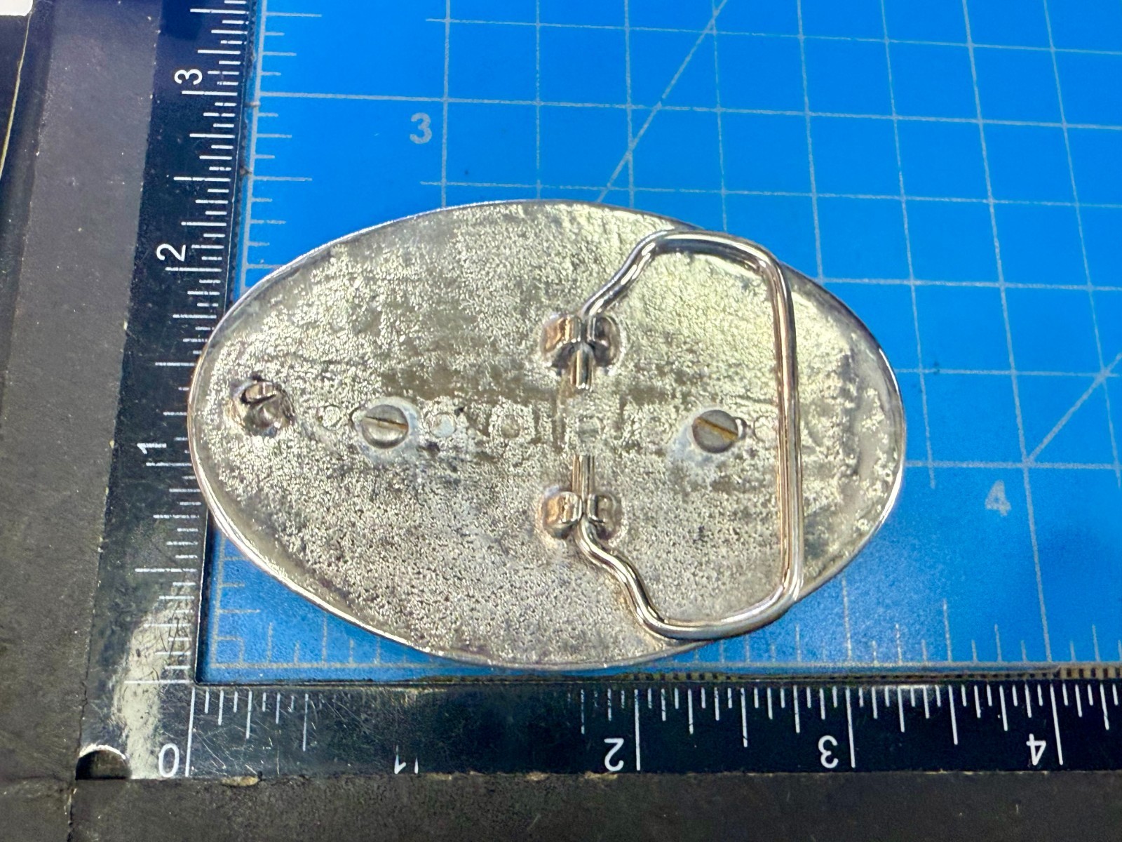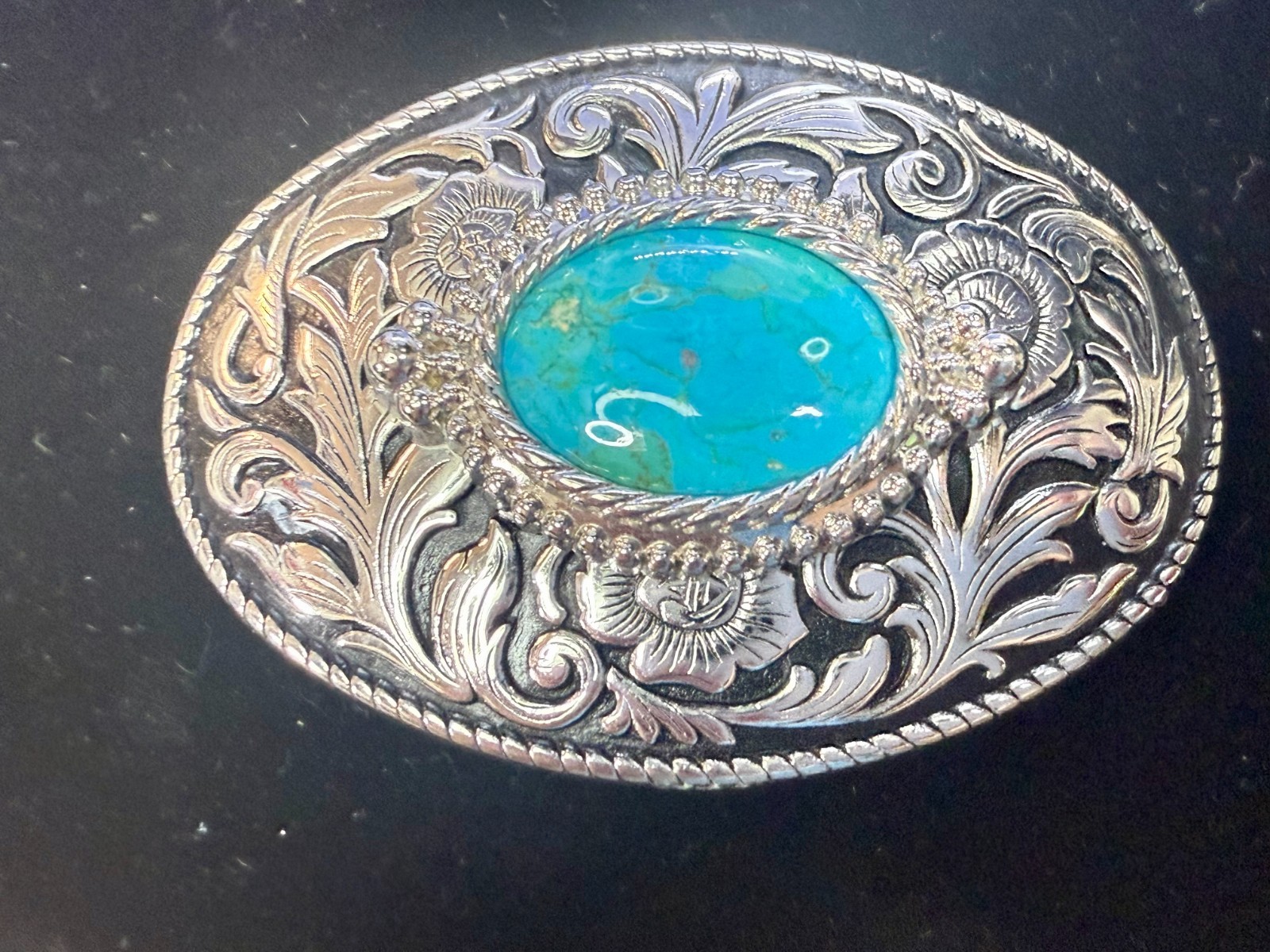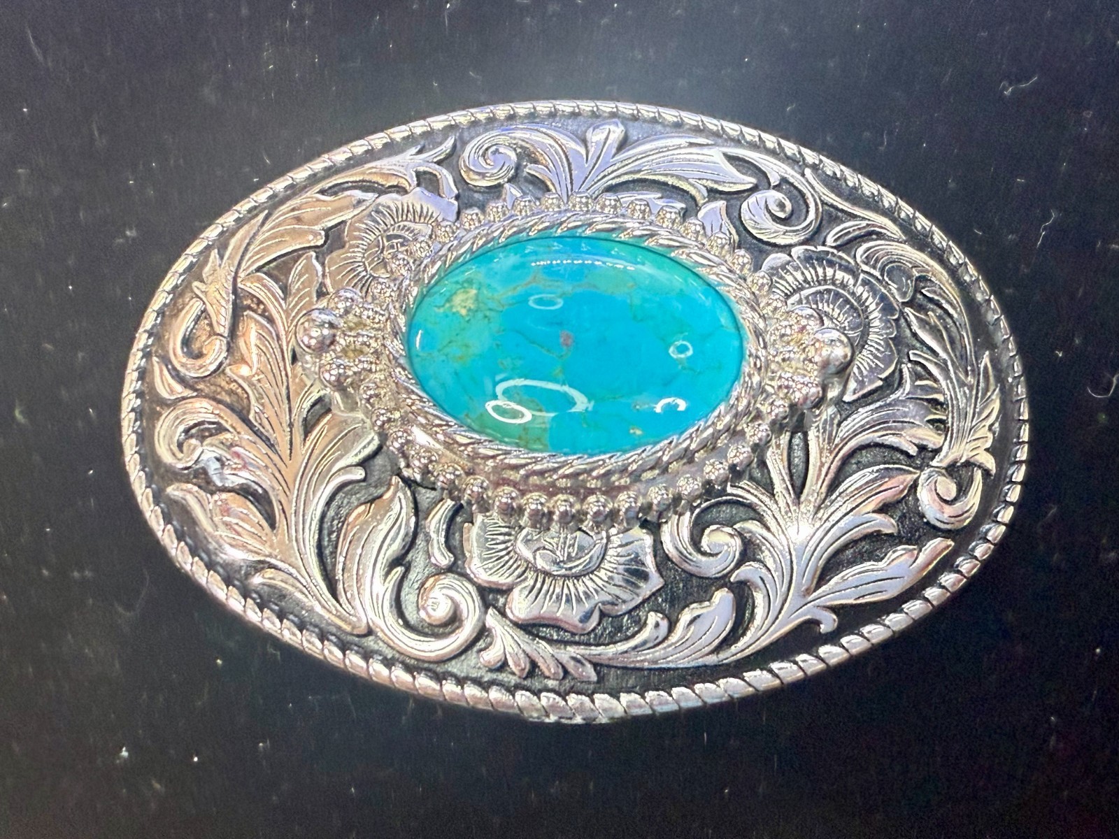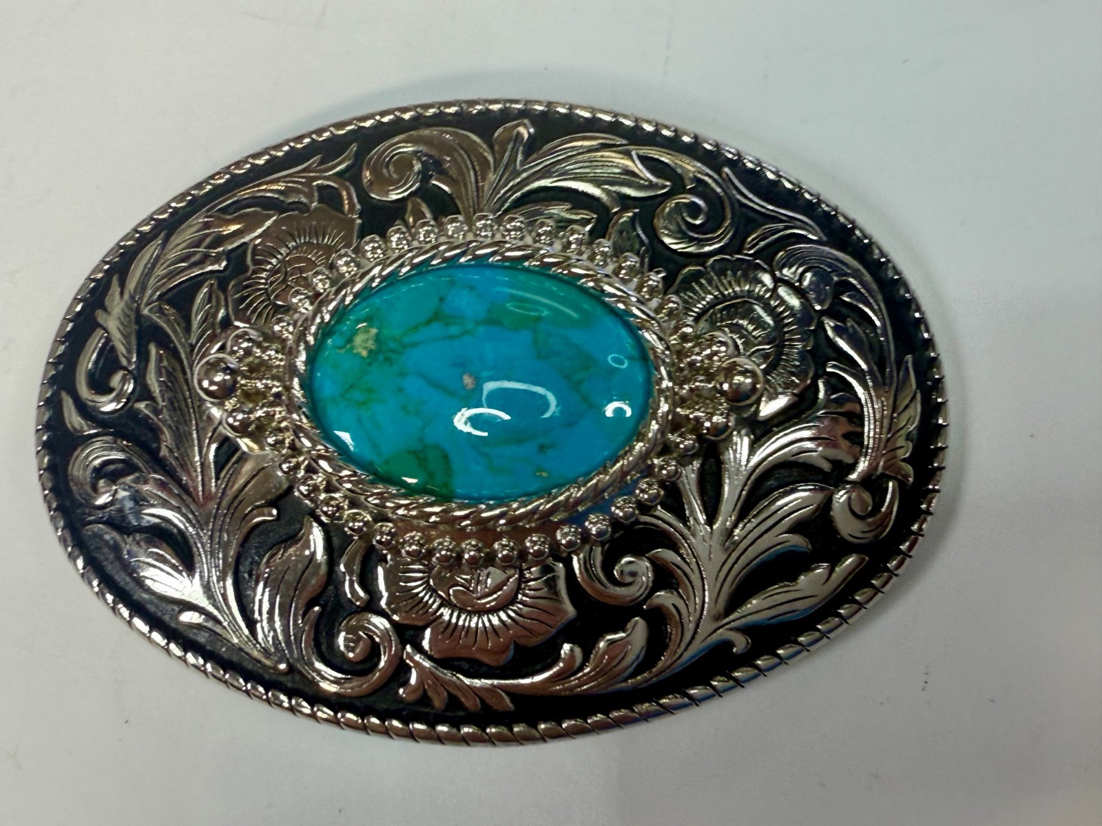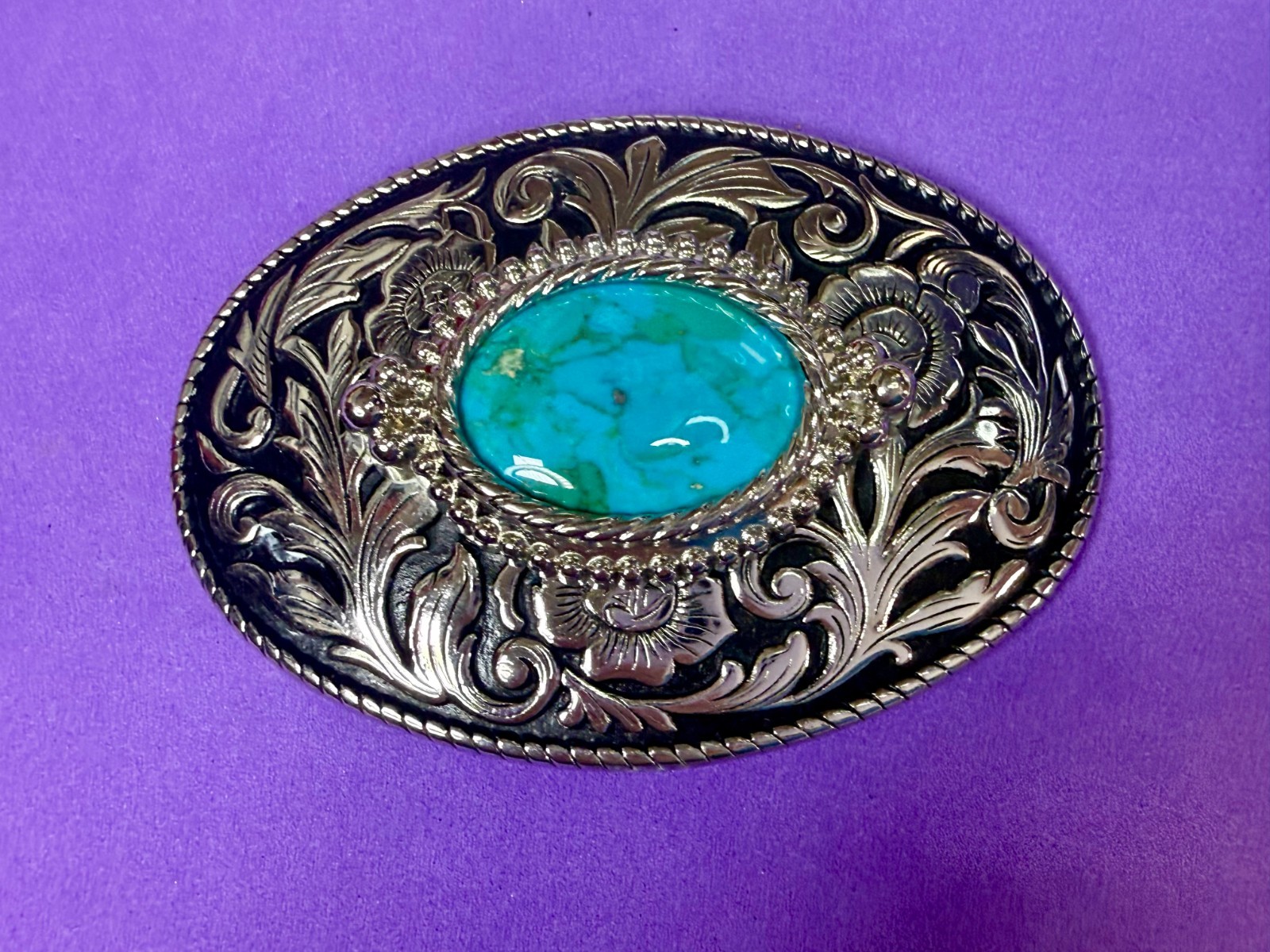 • Small Turquoise Cabochon Stone on Black Silver Color Western Oval Belt Buckle