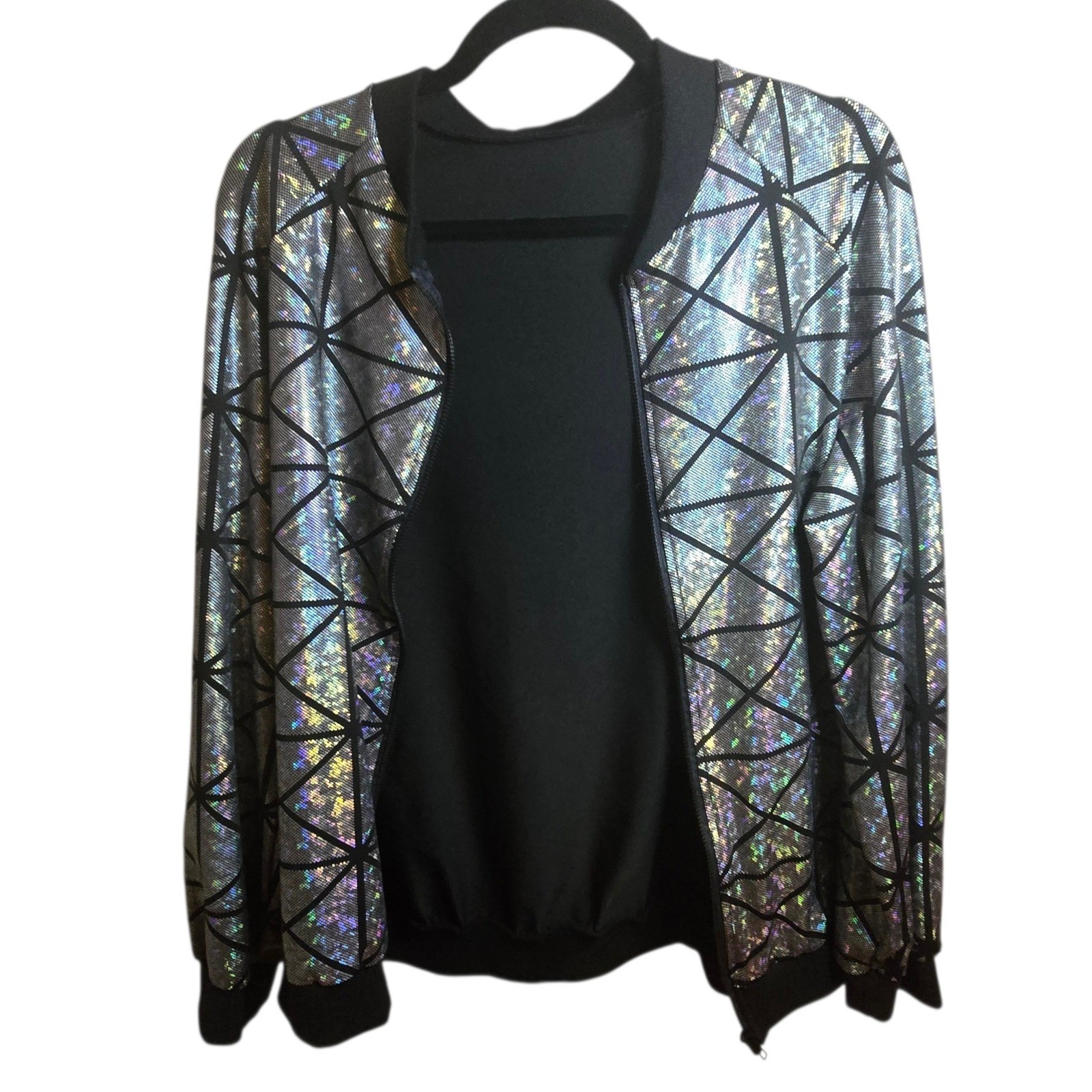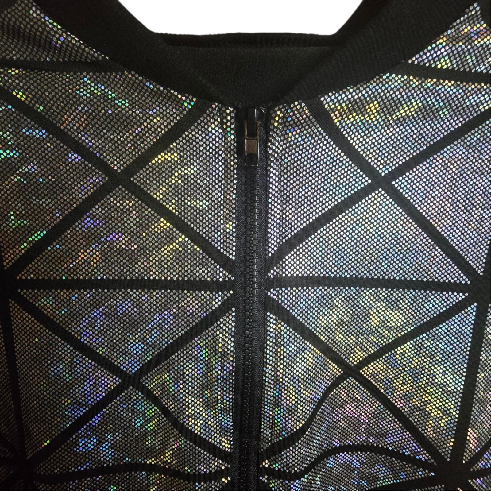 Holographic Black Silver Zip Jacket Geometric Festival Rave Adult M
