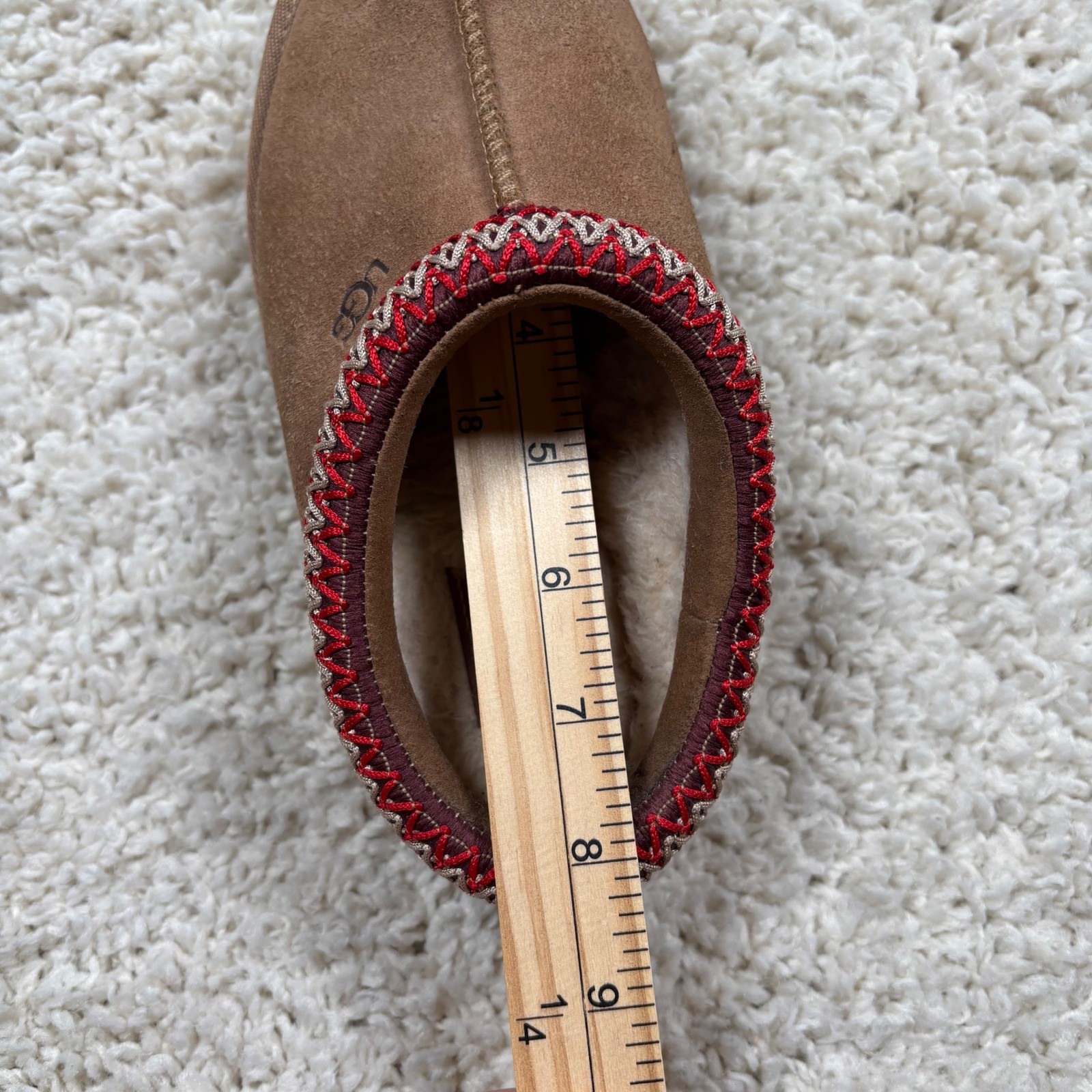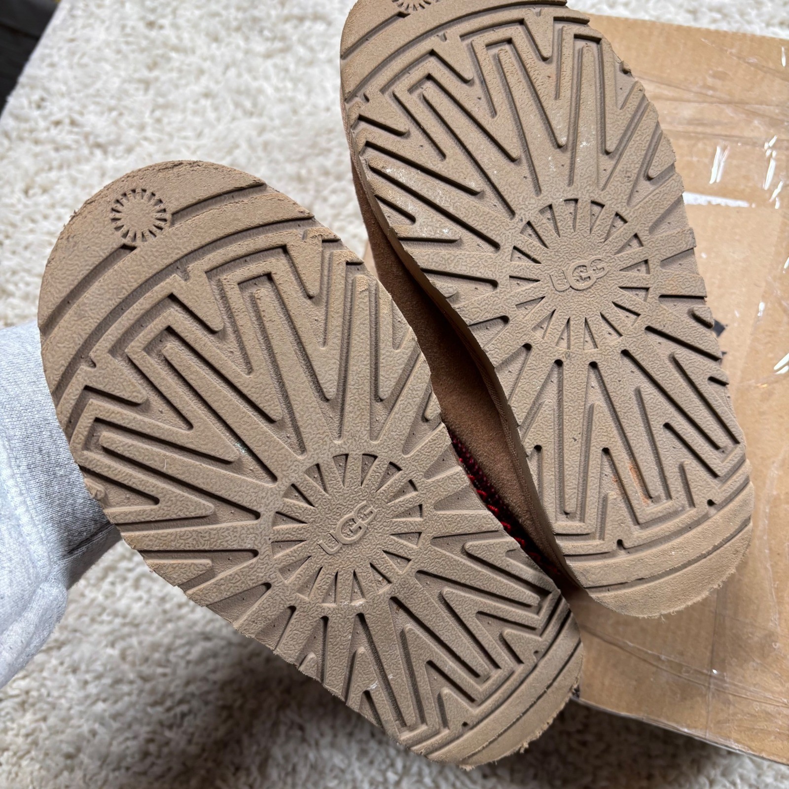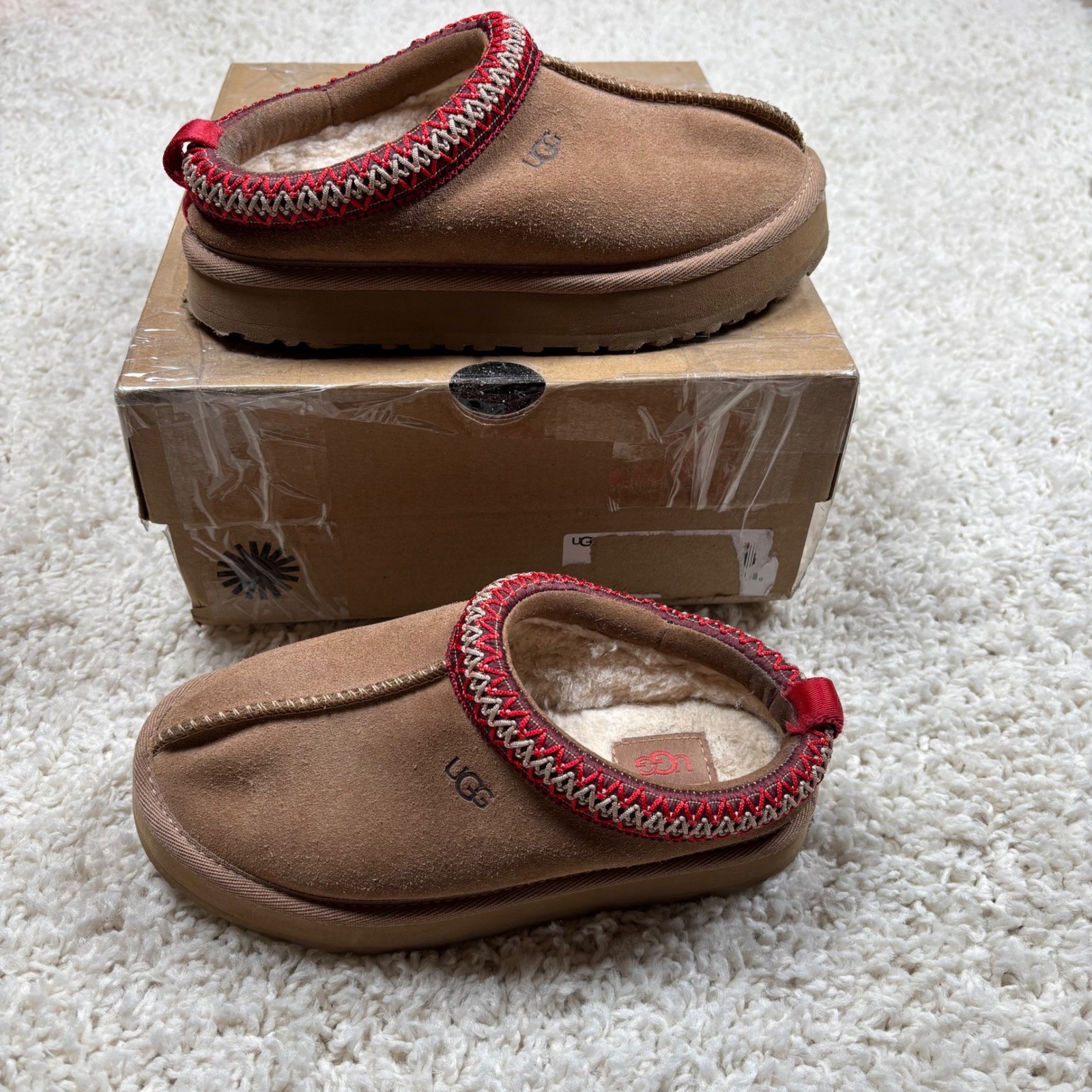 как выглядит UGG Kids Brown Suede Sheepskin Lined Slippers Mules Red Trim Size Toddler фото